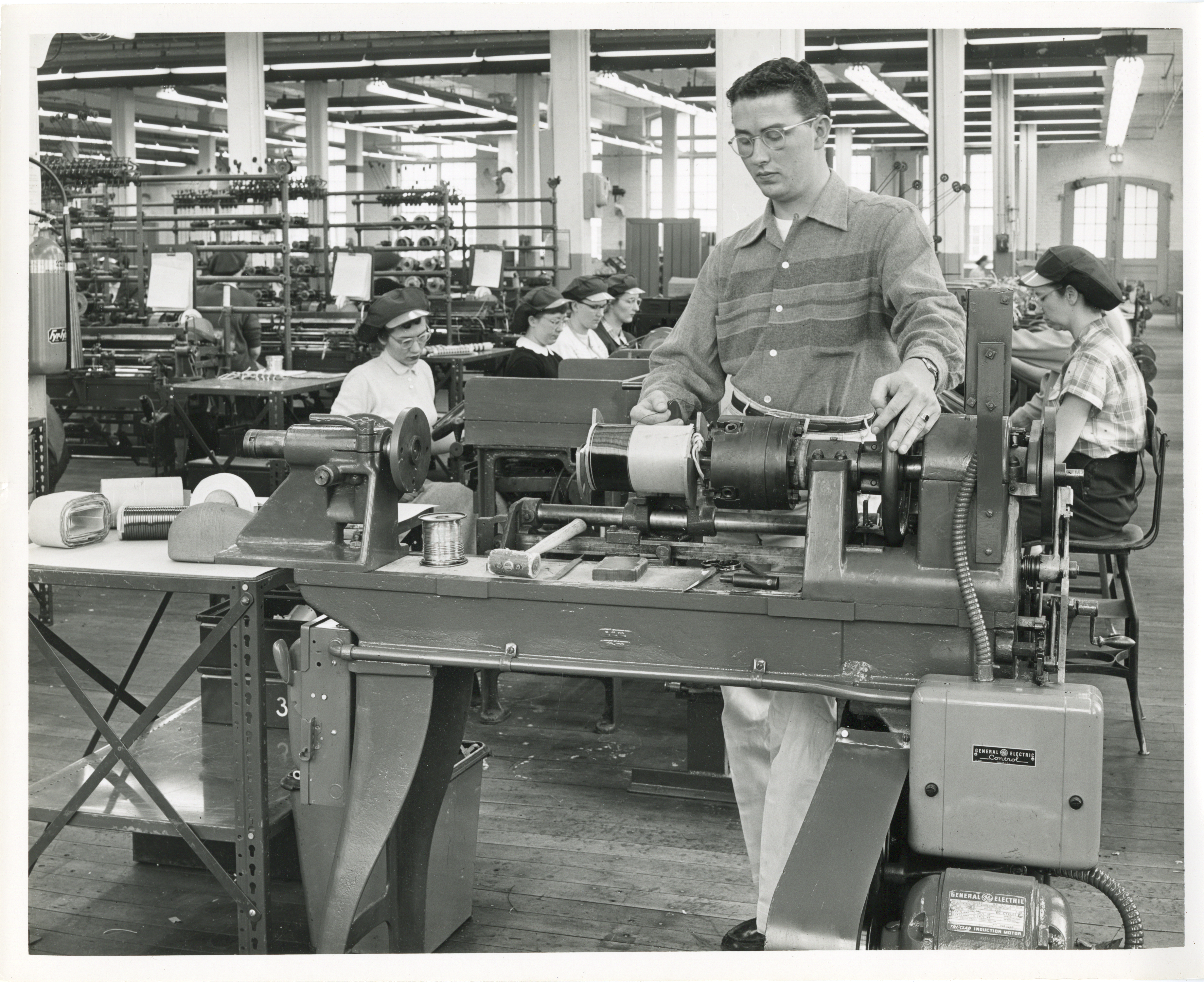 Adult using wire-winding equipment at the Western Electric Tarheel Army Missile Plant
