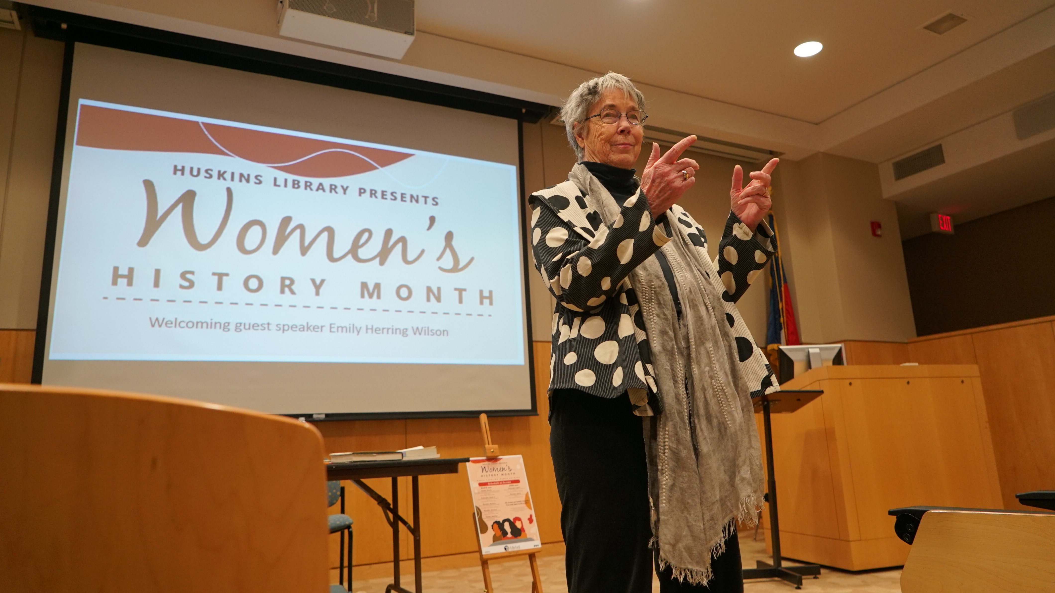 Emily Herring Wilson speaking at Rotary Auditorium in the J.P. and Mildred Huskins Library on Monday, March 2 at 12:30 PM. She discussed the history of Mitchell Community College and about notable North Carolina women, including Virginia Dare, Harriet Jacobs, Ella May Wiggins, and Mary Martin Sloop. She ended her talk by encouraging the audience to continue to fight against inequity. This program was supported by grant funds from the Institute of Museum and Library Services under the provisions of the Library Services and Technology Act (LSTA) as administered by the State Library of North Carolina, a division of the NC Department of Natural and Cultural Resources (IMLS grant number NC-19-54).