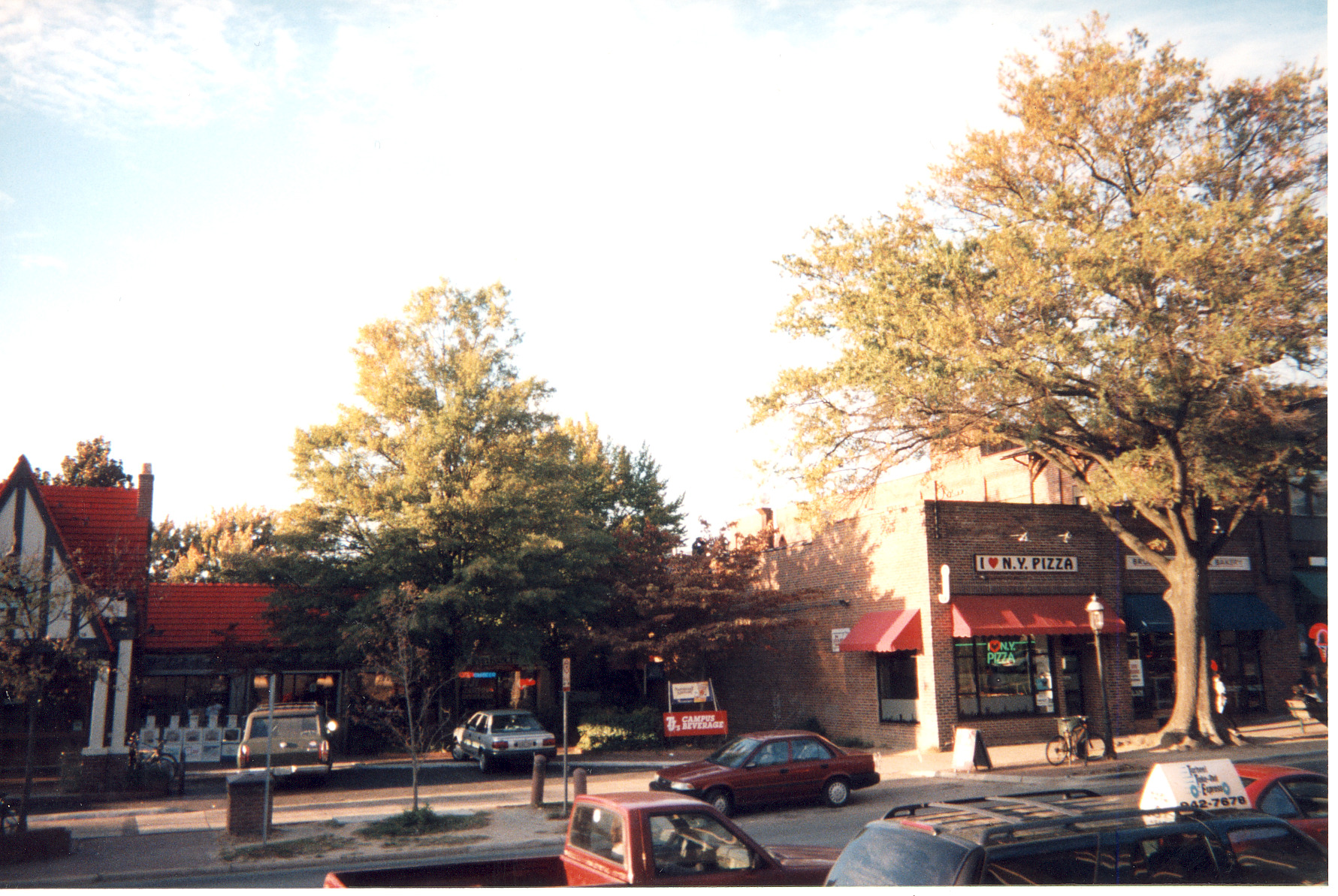 Photo taken from the opposite side of the street of several shops on West Franklin Street, Chapel Hill, North Carolina. I Love N.Y. Pizza and TJ's Campus Beverage are visible.