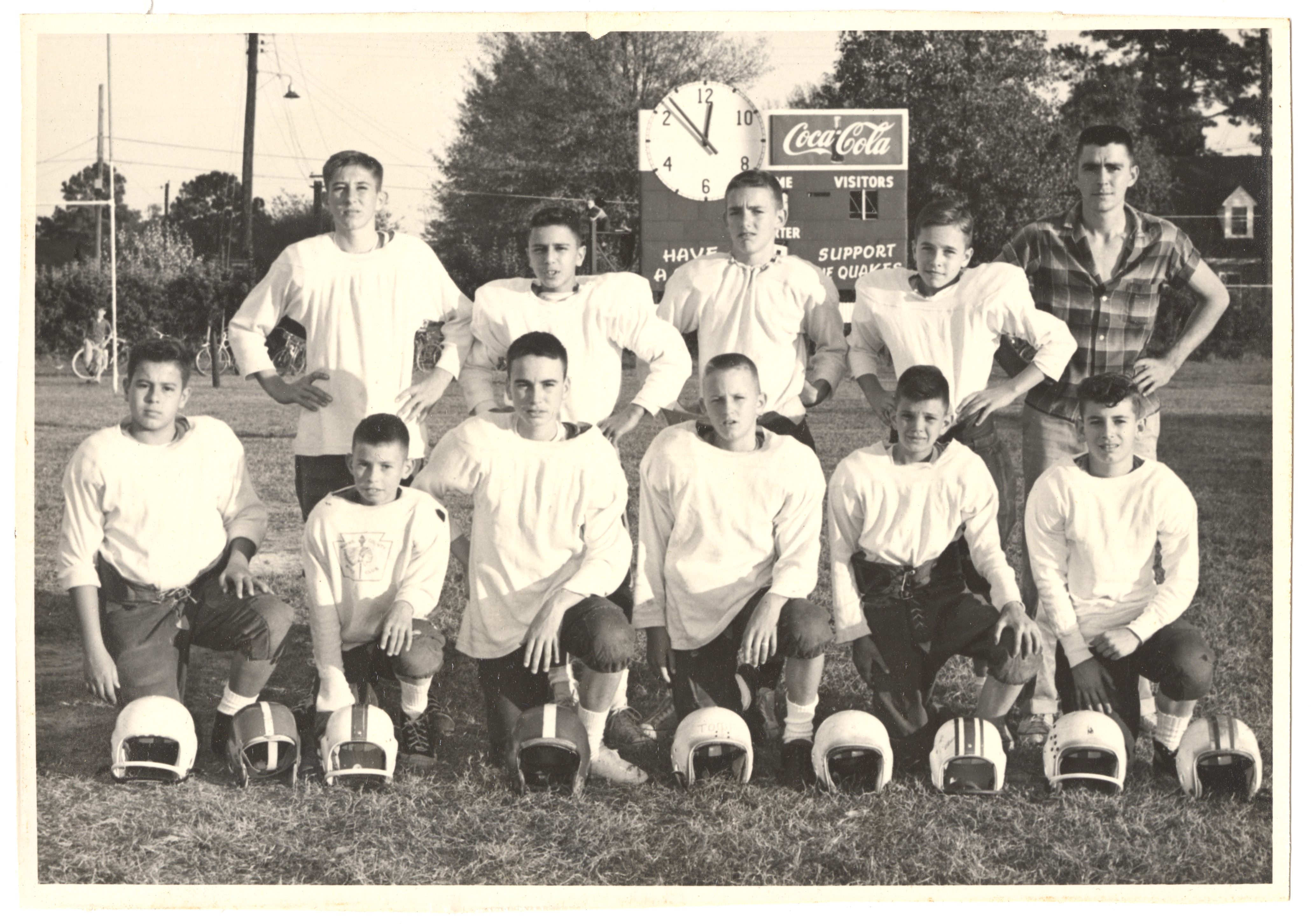 A black-and-white photo of a youth football team posing on the football field. The coach is also present.