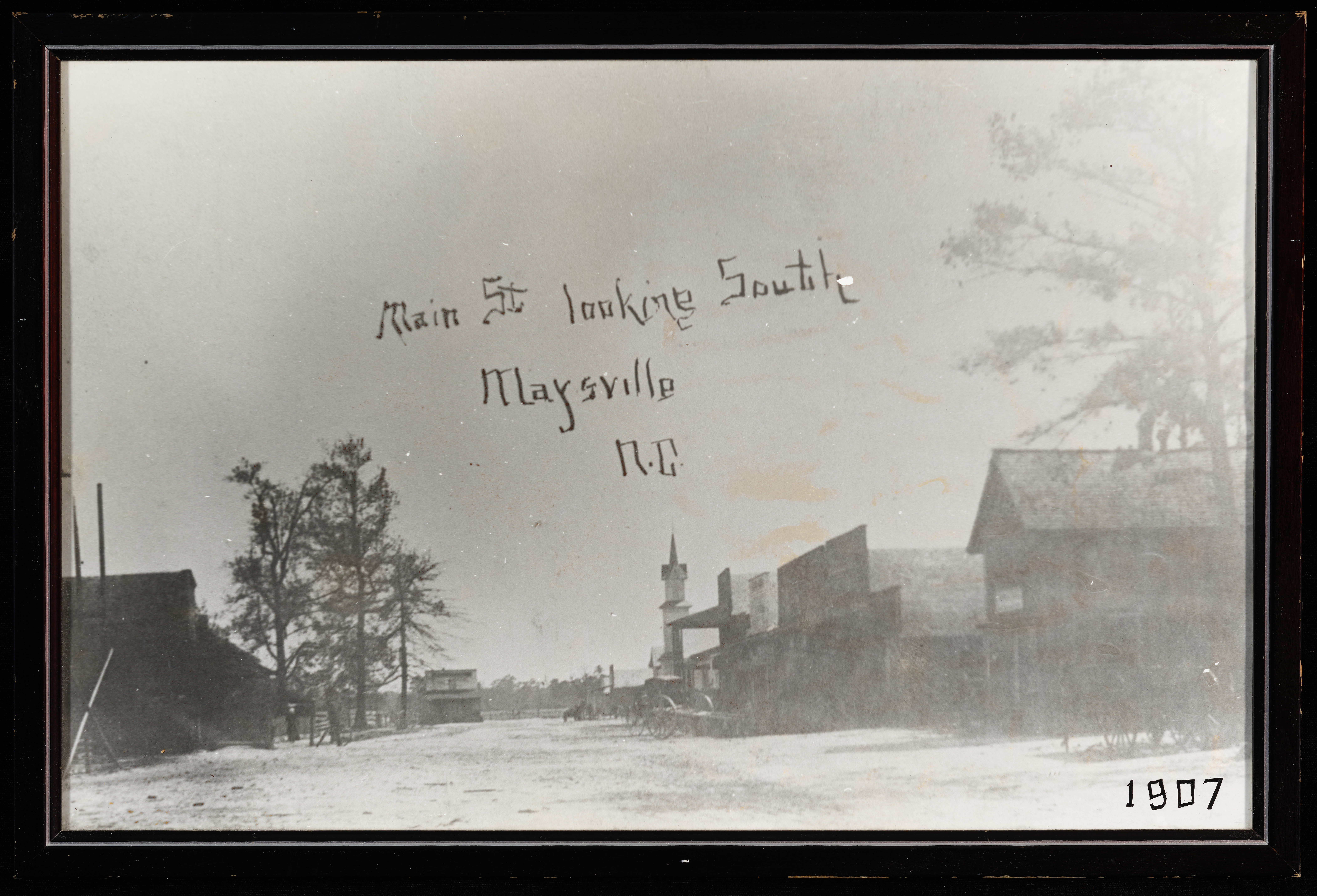 A black and white photograph from Main Street, facing south, in Maysville, N.C. The photograph is framed with a black wooden frame.