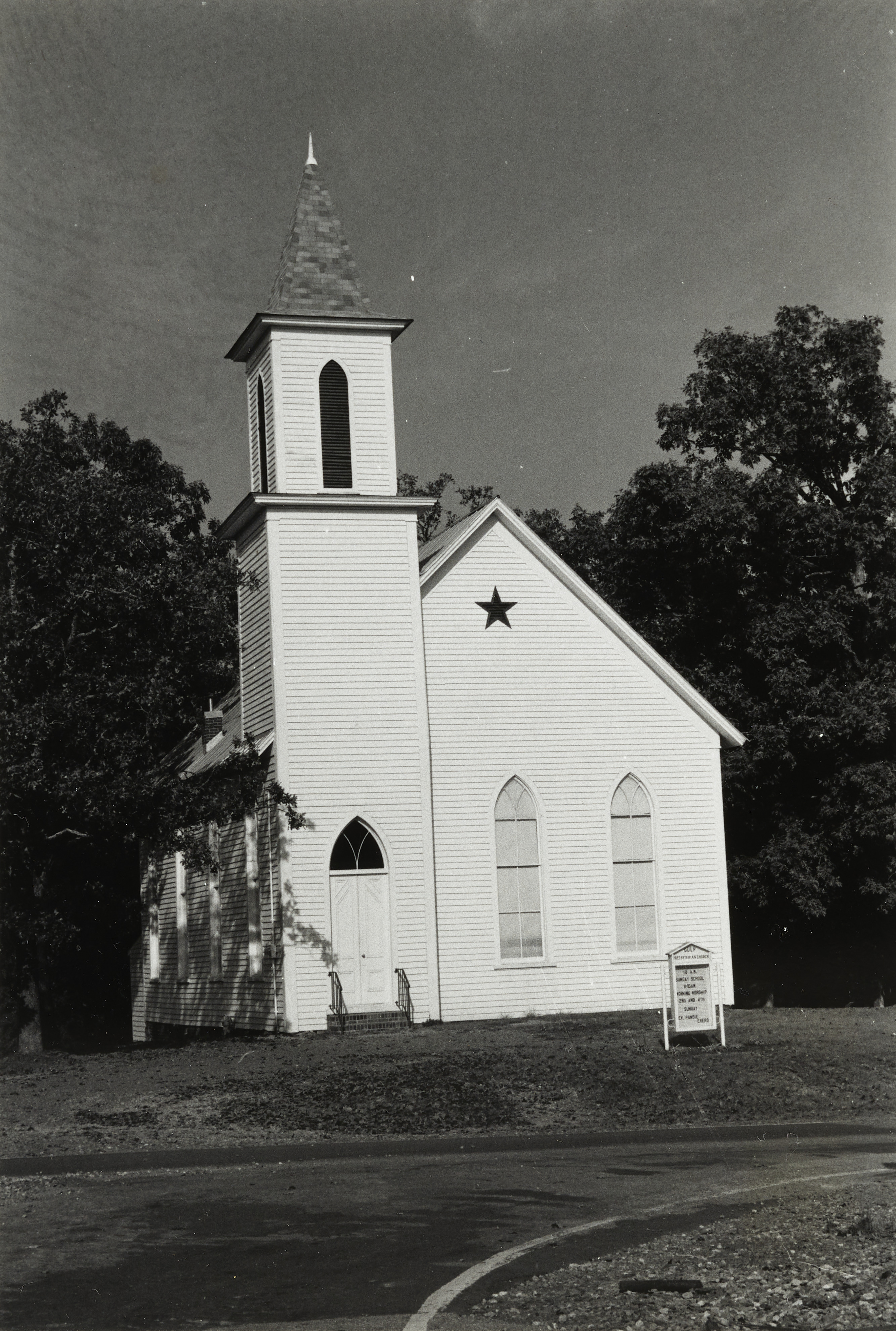 This church is a white frame gable-front Gothic Revival country church, three bays wide by four bays deep. It contains an off-center two-stage entrance tower with a steep witches'-cap roof and simple finial, a star-shaped ventilator in its central gable, triple-hung sash windows, and double-leaf entrance doors surmounted by Gothic-arched upper sections. It was built in 1882. More information about this photograph can be found on page 254-255 of the book The Architectural Heritage of Chatham County, North Carolina written by Rachel Osborn and Ruth Selden-Sturgill.