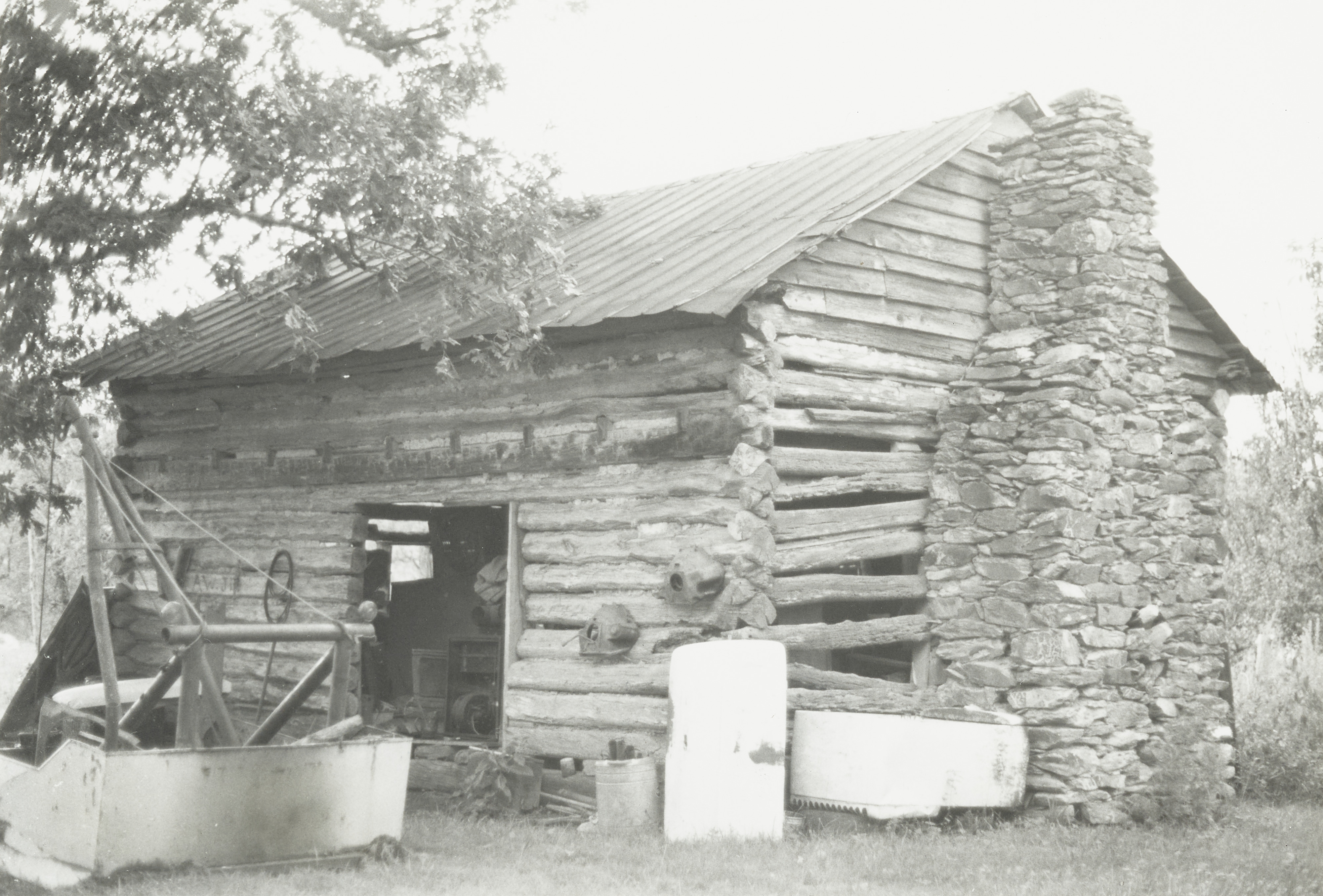 The cabin, built circa 1860, was originally a one-room board-and-batten structure with a large rubblestone chimney and a detatched board-and-batten kitchen. In 1906 a two-story two-bay gable-front section with a diamond-shaped ventilator, scalloped shingling, and weatherboard was added to the structure. More information about this photograph can be found on page 284 of the book The Architectural Heritage of Chatham County, North Carolina written by Rachel Osborn and Ruth Selden-Sturgill.