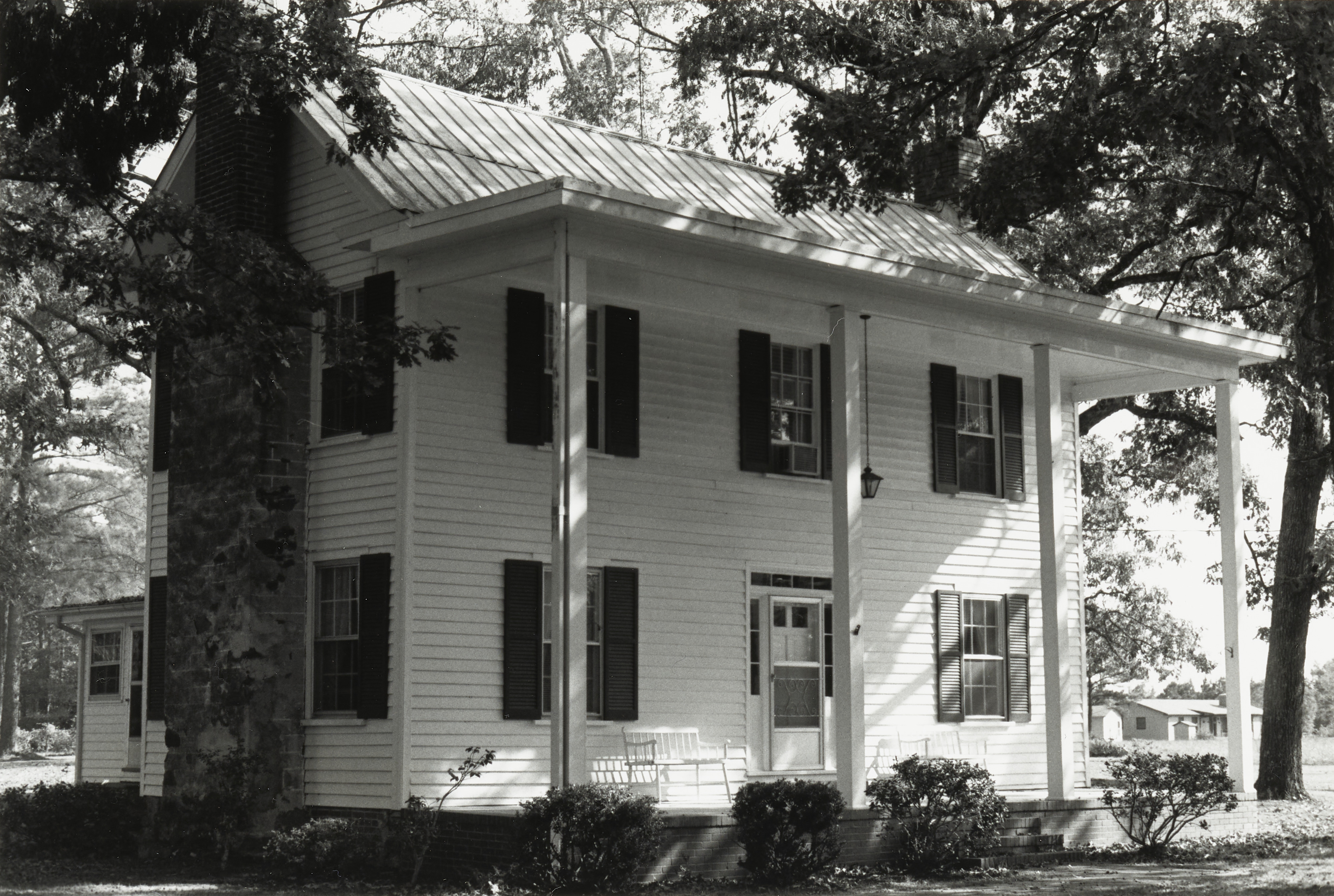 The residece, built circa 1875, is a two-story three-bay house with a single-pile L-plan, sidelights and transom in molded surrounds framing the single-leaf entry, cornice returns, molded capitals on the plain cornerposts, two end chimneys, and a mantel in the main room with molded-diamond frieze panel. One of the chimneys is original with an offset brick stack and stone base treated with coursed roughcast. In the 1940s the one-story ell was enlarged and the front porch changed to two stories. More information about this photograph can be found on page 317 of the book The Architectural Heritage of Chatham County, North Carolina written by Rachel Osborn and Ruth Selden-Sturgill.