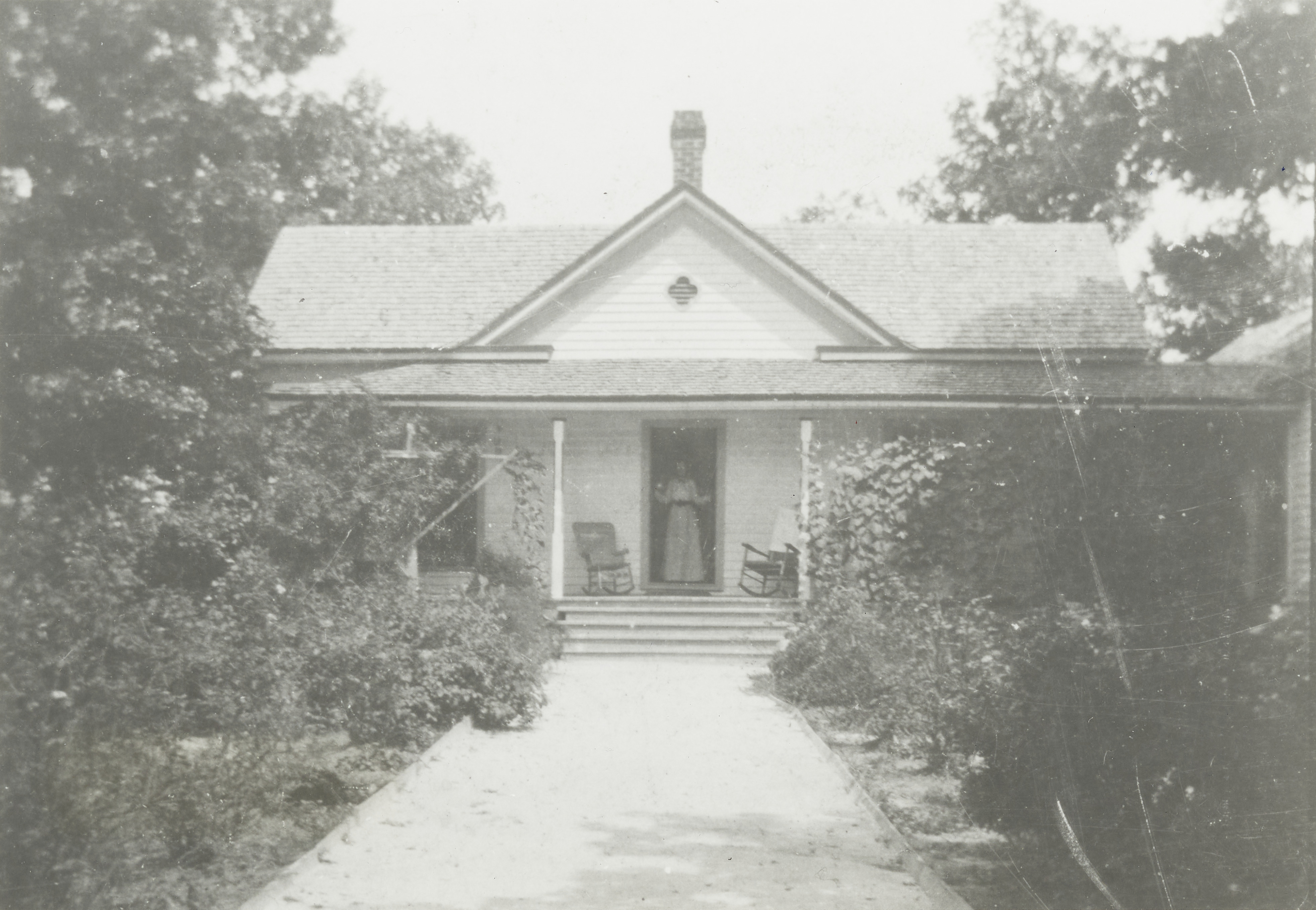 The residence is the result of two L-plan houses placed at right angles to each other. The northern L-plan structure, a variation of the common 1900 triple-A central-hallway house, has cornice returns, quatrefoil ventilators, shuttered four-over-four sash windows that are paired at its five-bay main facade, one simple Victorian mantel with sawn frieze, and an internal brick chimney. The southern L-plan strucutre is plainer. It has a massive stone-and-brick chimney at its ell and an internal chimney stack. More information about this photograph can be found on page 335 of the book The Architectural Heritage of Chatham County, North Carolina written by Rachel Osborn and Ruth Selden-Sturgill.