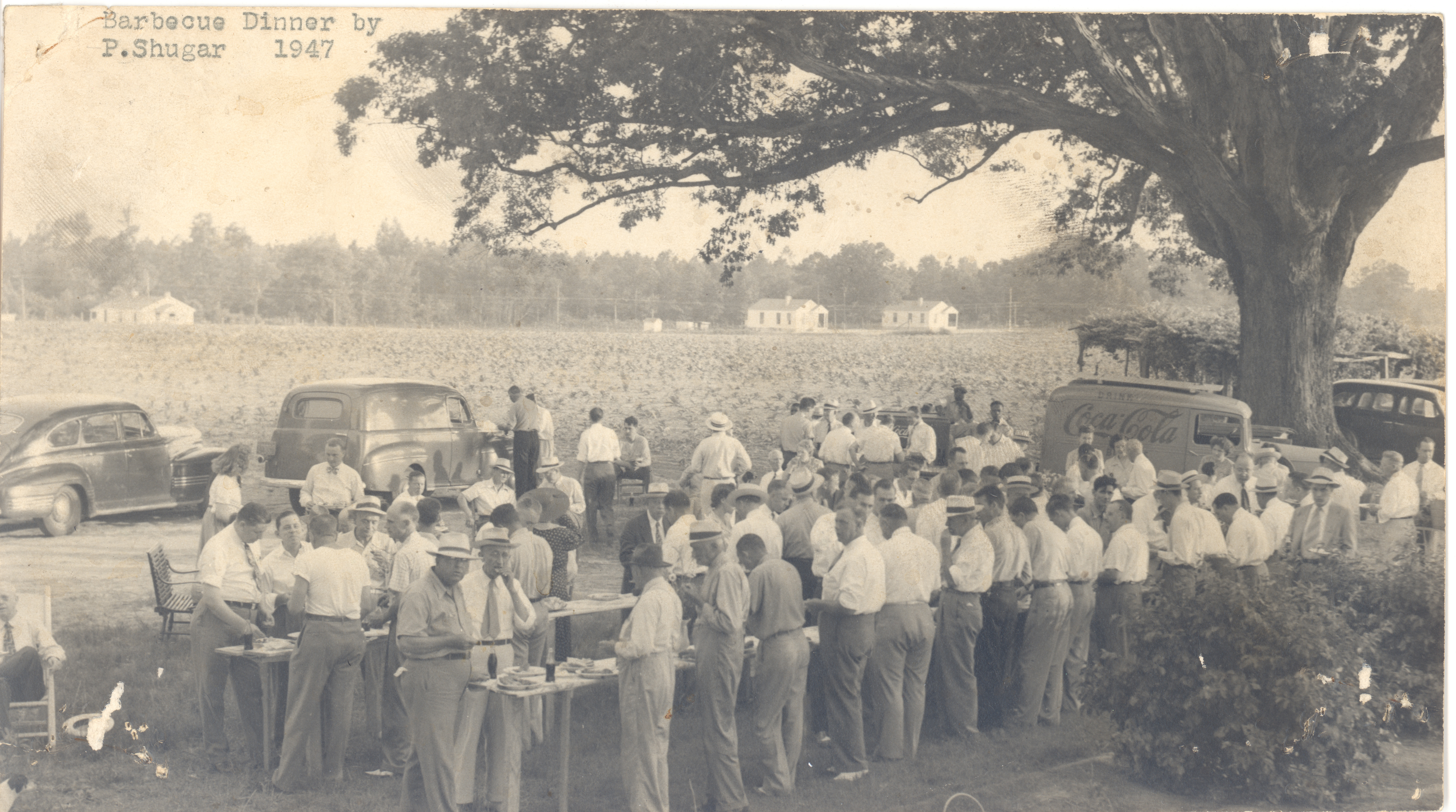 Large group of adults eating barbecue at farm of Philip Shugar, Fire Tower Road, Edgecombe County, N.C. Cars and trucks in background. Gift of B. M. Bass Jr., March, 1987.