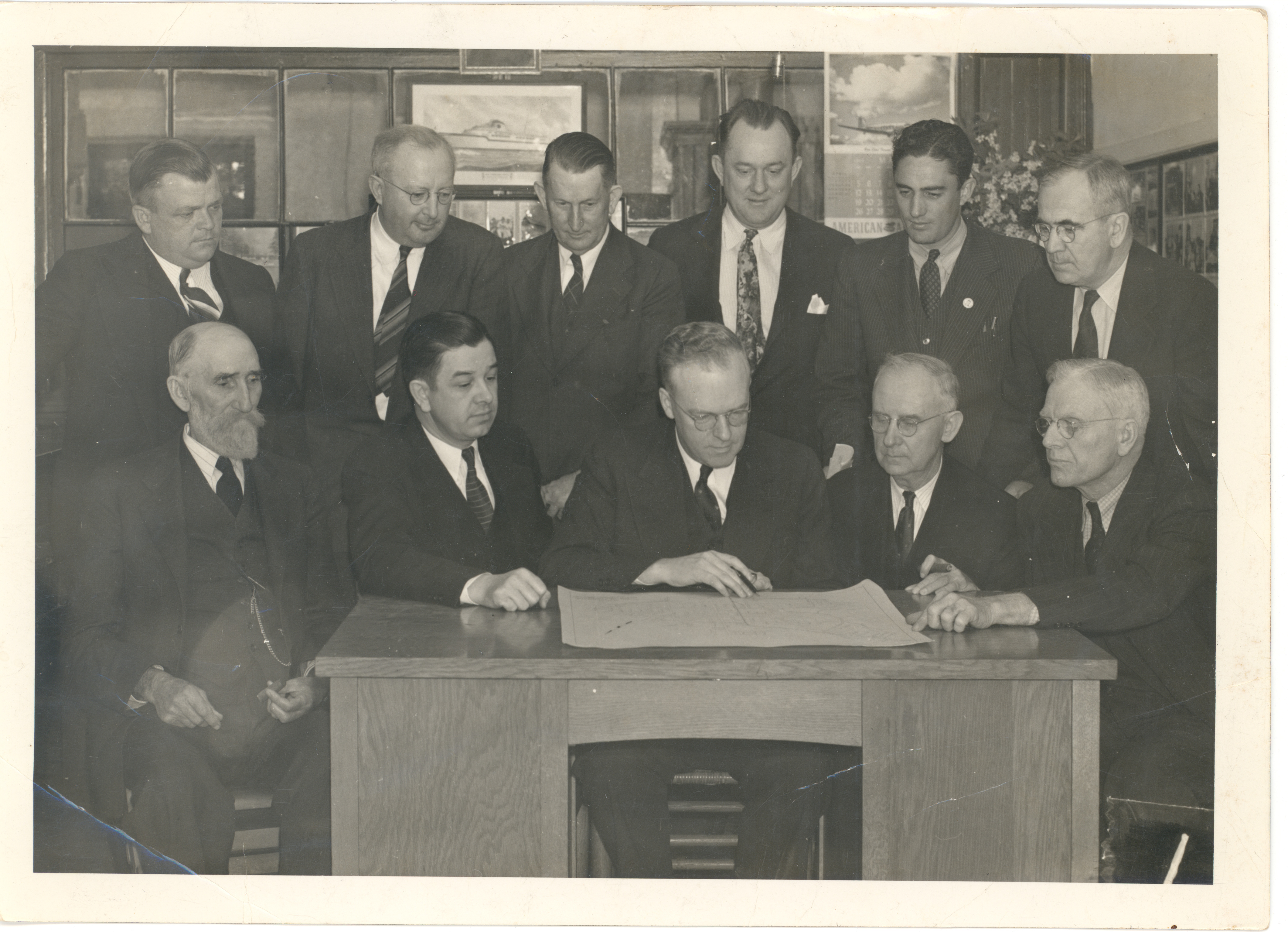 Unidentified individuals with Lyn Bond, Attorney; George Earnhart, Clerk; J. P. Keech, Judge; R. B. Peters, Jr., Mayor. Tarboro officials examining map of town. Gift of Miss Mary Ferebee Howard, 1985.