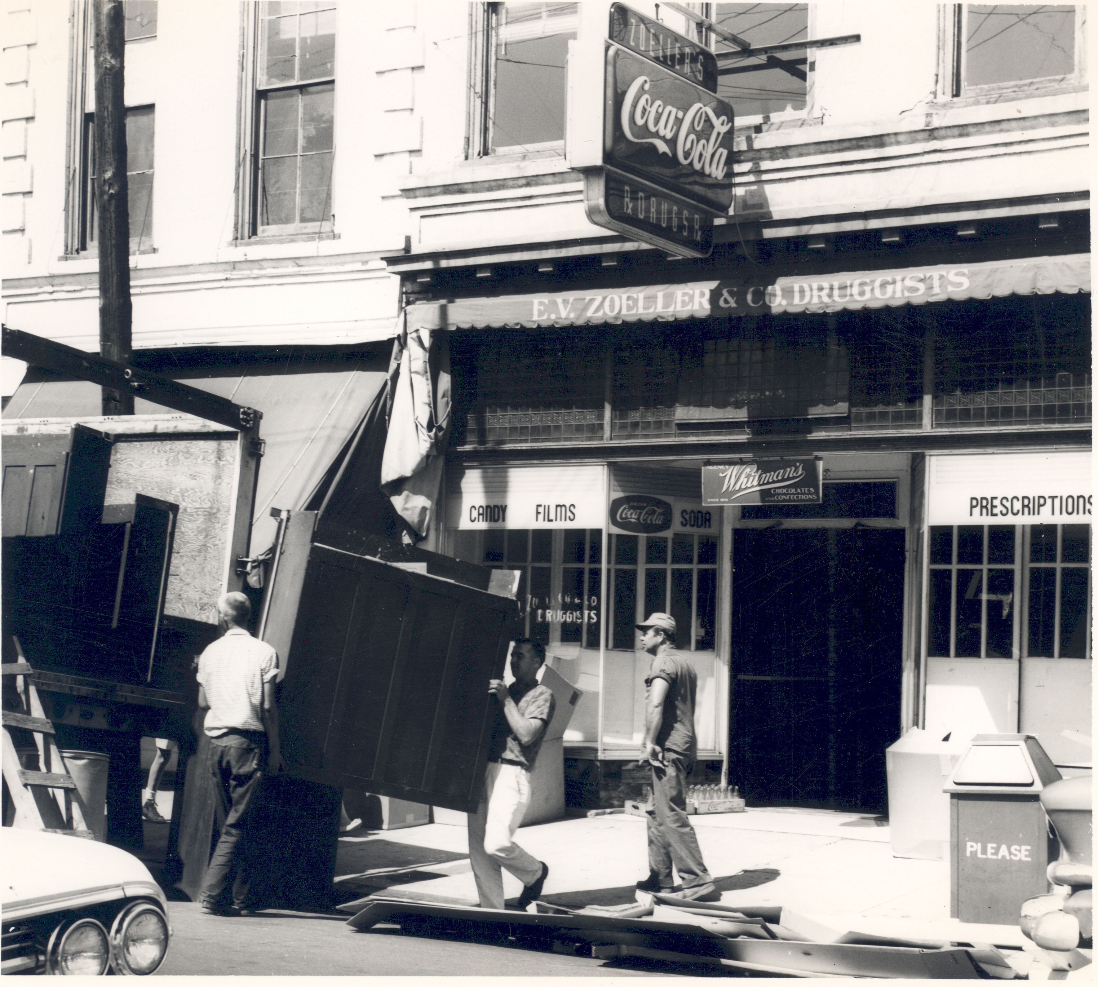 Adults removing fixtures from drug store located on northeast corner of Main and St. James streets. Gift of B. M. Bass, Jr., 1987.
