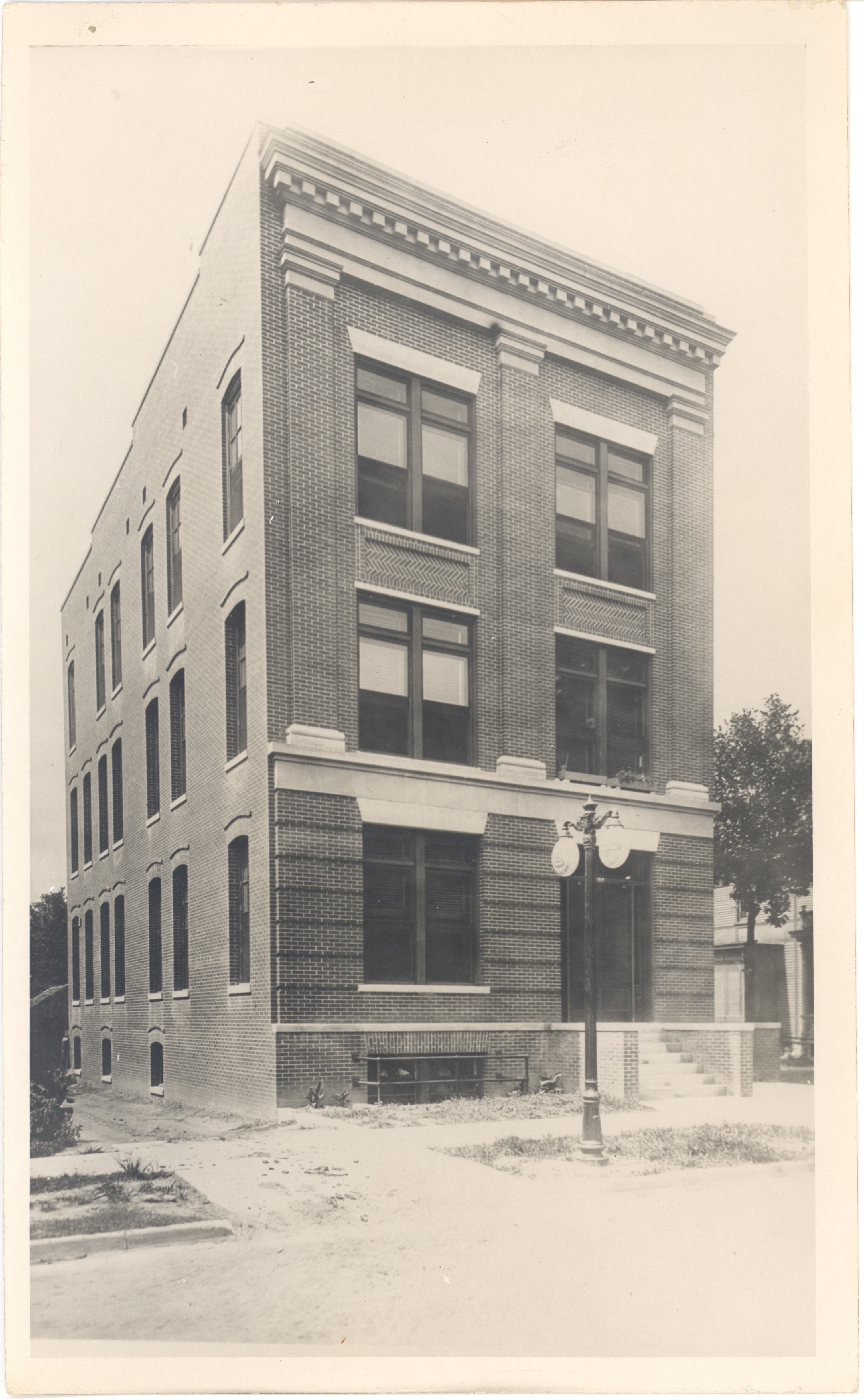 South (front) and west elevation of 3-story brick building ornate street lamp in front. Address: 122 E. St. James Street. Gift of В. M. Bass, Jr., 1987.