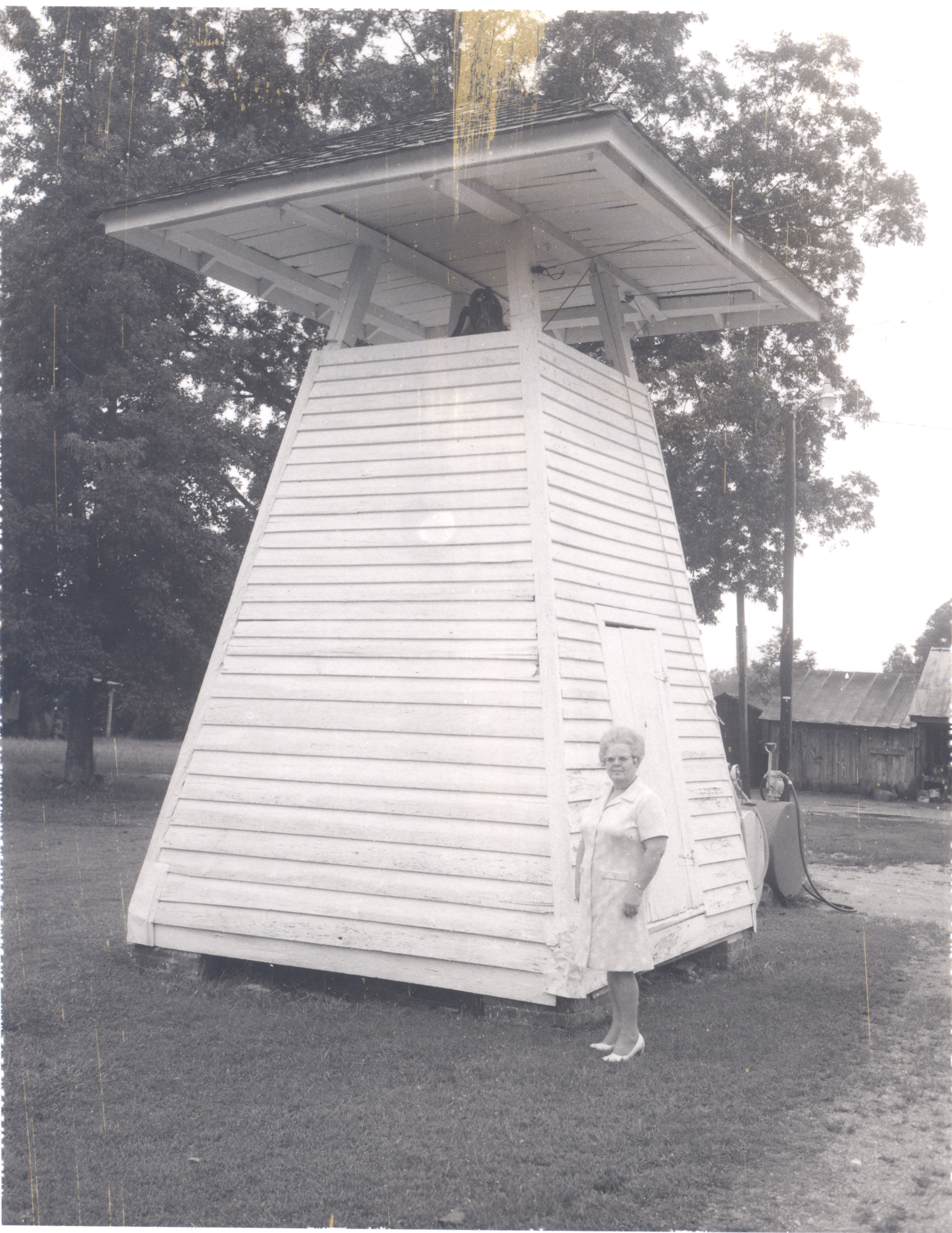 Adult standing beside outbuilding containing farm bell. Gift of В. M. Bass, Jr., 1987.