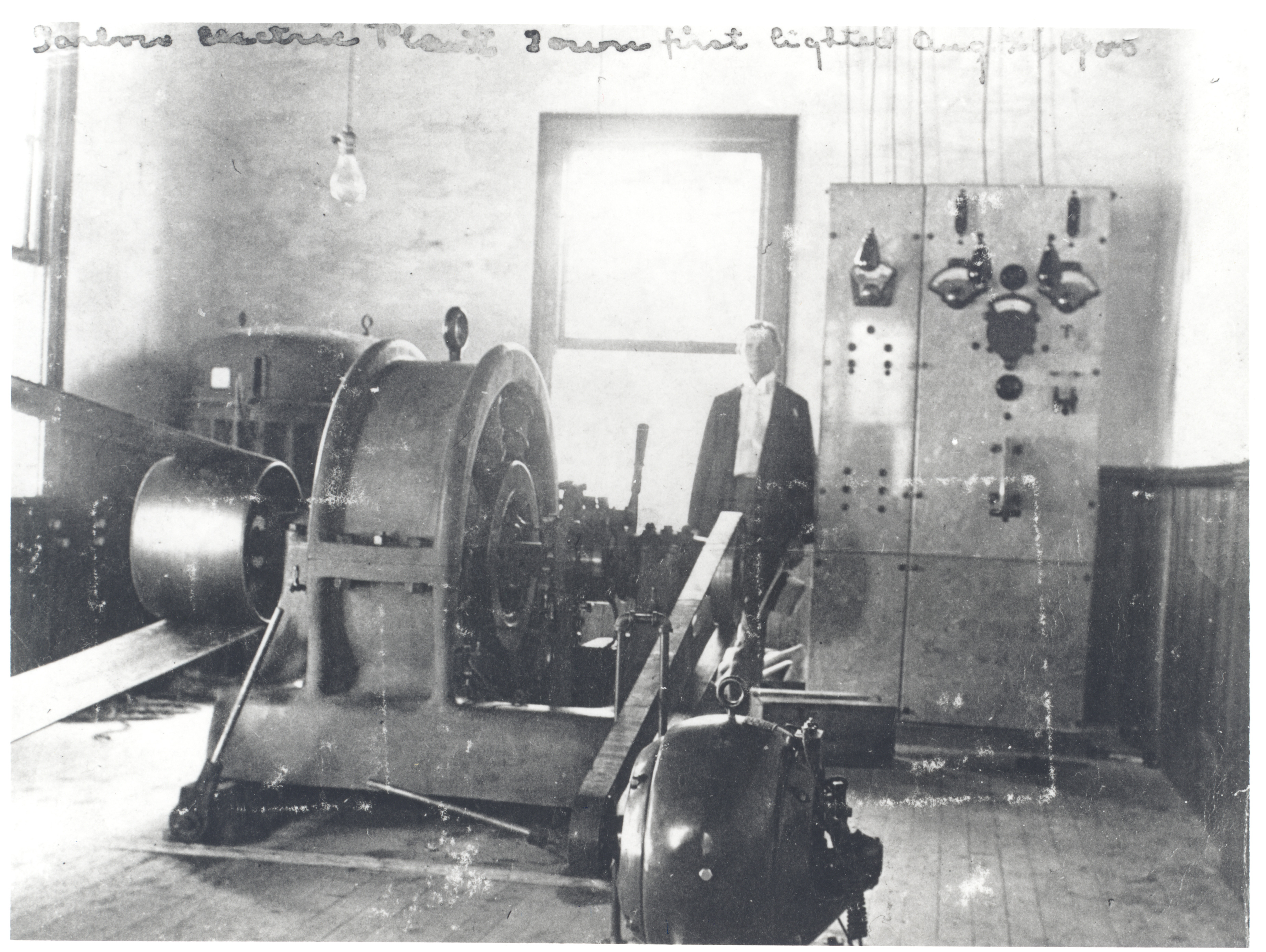 Town Clerk John A. Weddell standing with electric plant equipment, possibly at time electricity first made available in Tarboro. Copy of original in possession of Mrs. John Marvin Mebane, Rocky Mount, N.C. Negative 83.10.12, N.C. State Archives Raleigh.