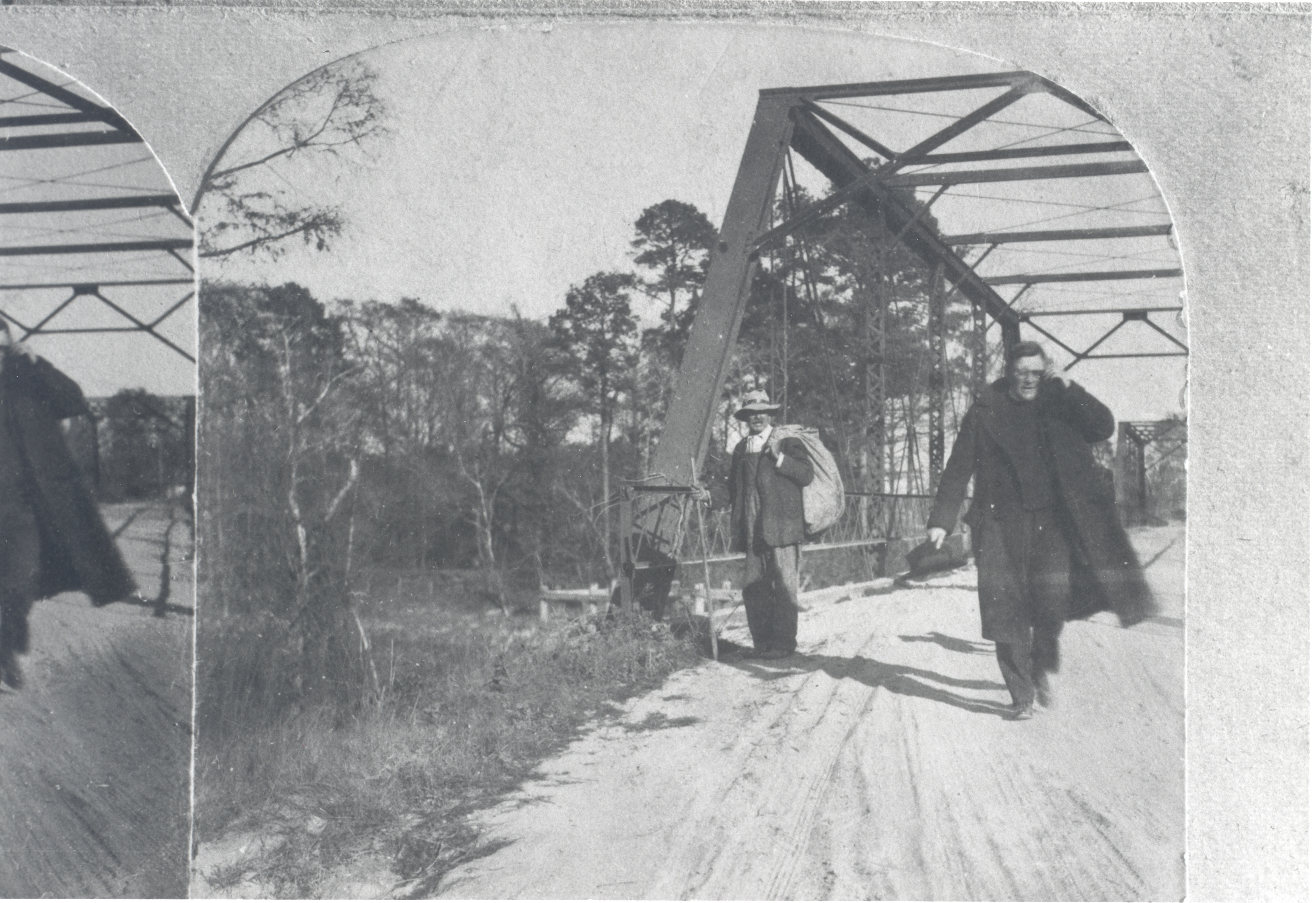 Adult watching the Rev. Bertram E. Brown walk off metal truss bridge (located just north of Present-day NC 42) over Tar River at Old Sparta, N.C. Copy of stereopticon card owned by Calvary Episcopal Church, Tarboro, N.C. Negative #88.12.114, N.C. State Archives, Raleigh.