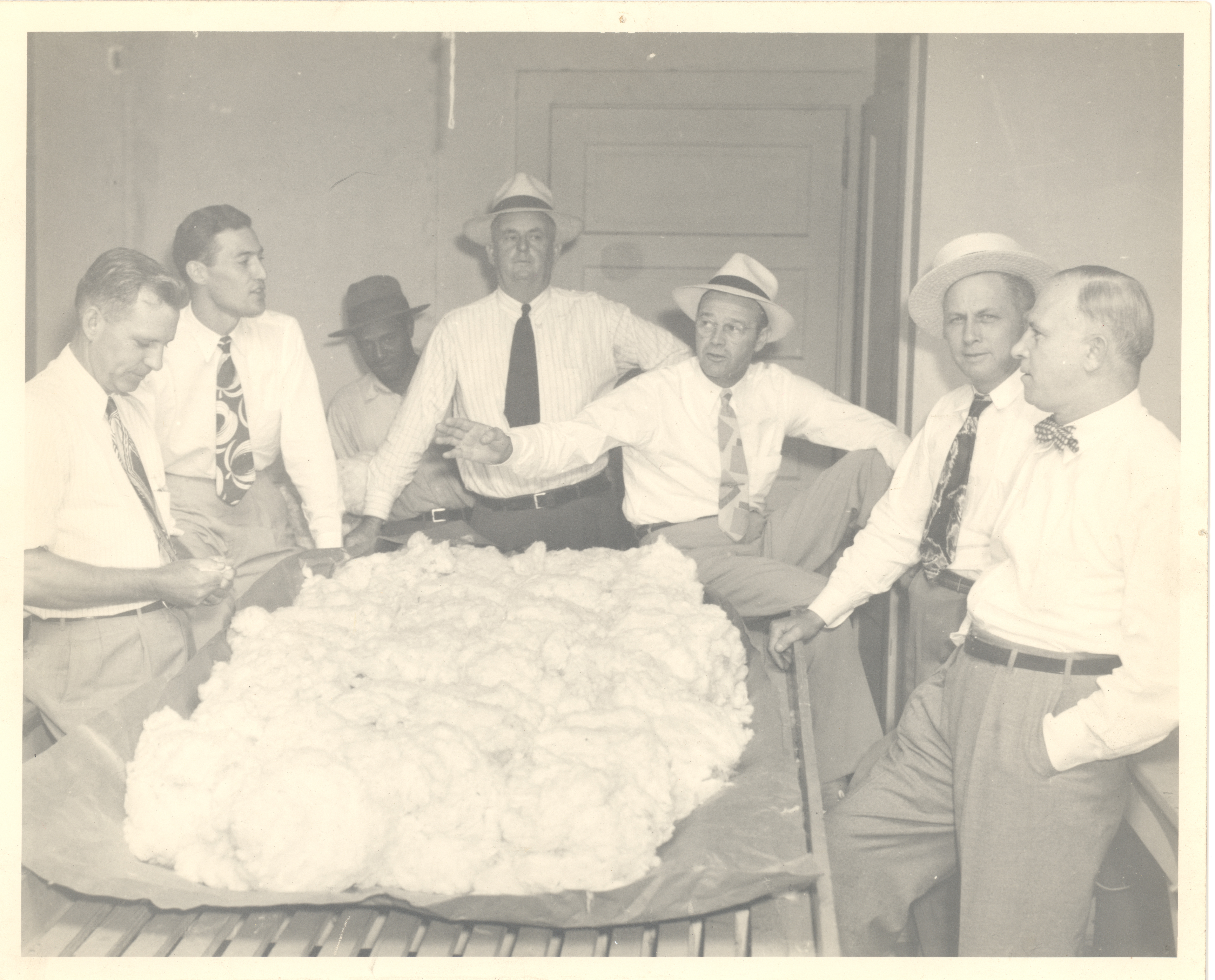 Buyers surrounding cotton on table, l. To r.: George Moore, Watson Smoot, Jr., Tom Davis, John Youngblood, John Samuel Dean, and Watson Smoot, Sr. "Coonie” Knight in background. Gift of William Dean, 1989.