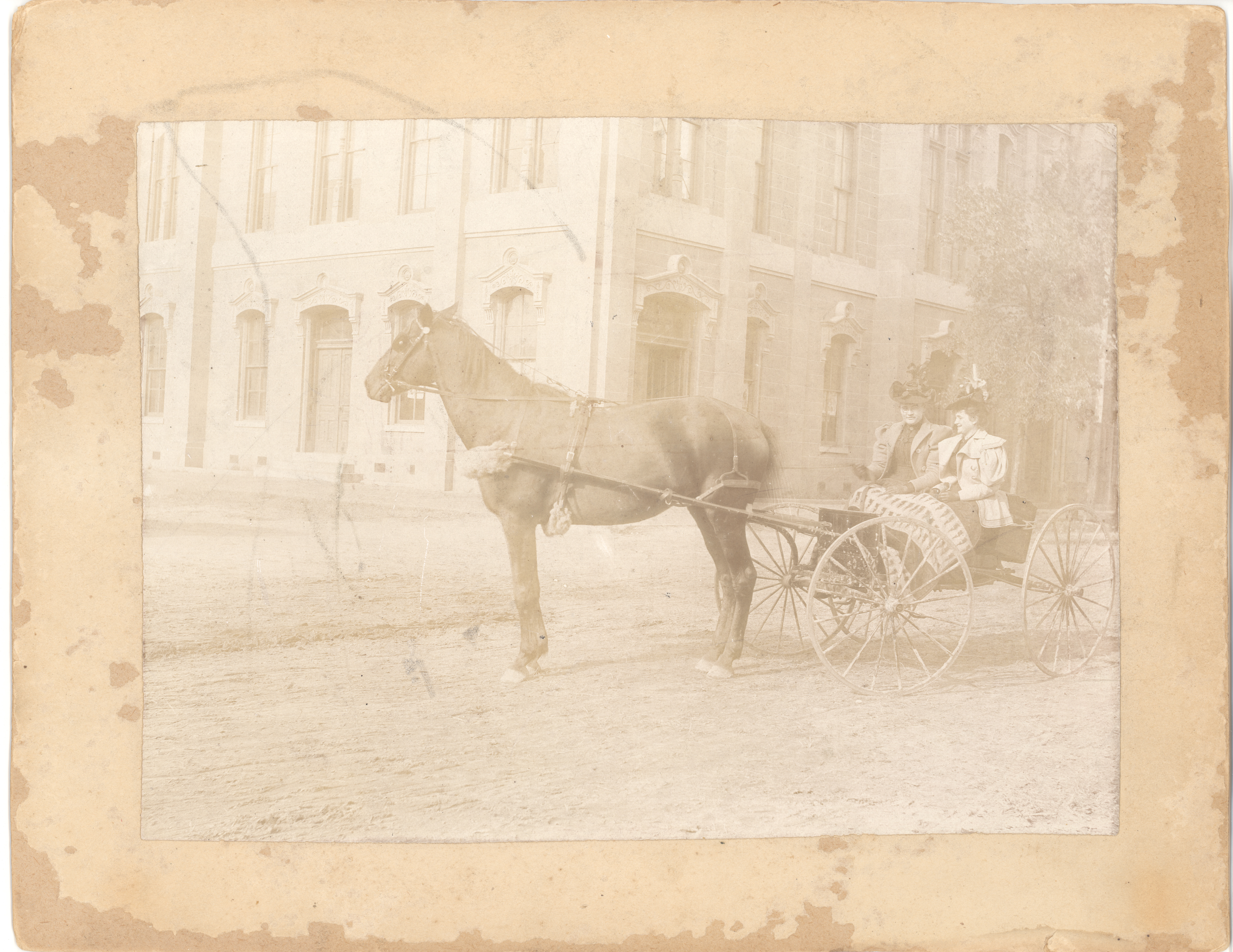 Two Adults in horse-drawn carriage. Town Hall in background. Gift of Edgecombe County Historical Society, 1989.