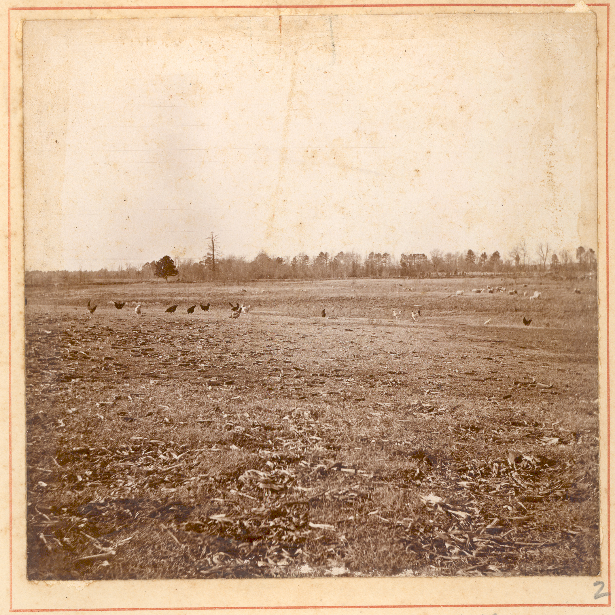Chickens in a field, possibly Panola Farm, near Tarboro, NC. There are sheep in background and animal bones visible in foreground. Title taken from caption beneath photo.