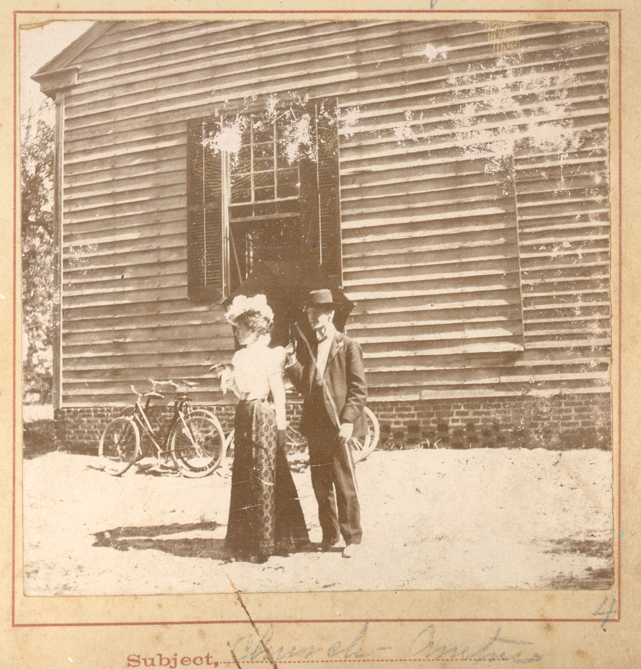 To unidentified people standing outside of the Primitive Baptist Church in Tarboro, NC. The church window is open and bicycles are propped against the side of the building in the background.
