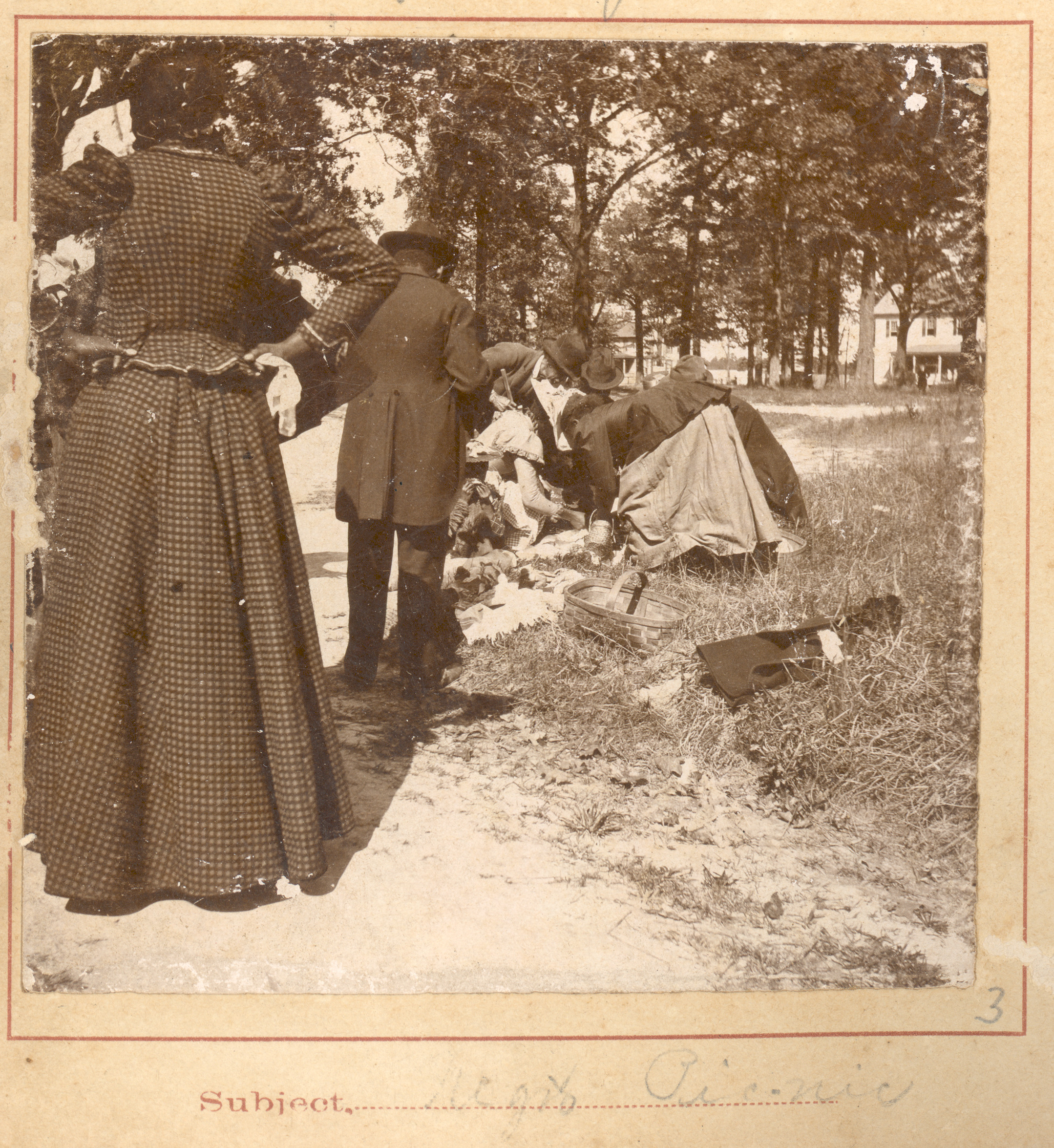 Five or six people African American people having a picnic in the Town Common. Houses are visible in the background. Title taken from caption beneath photo.