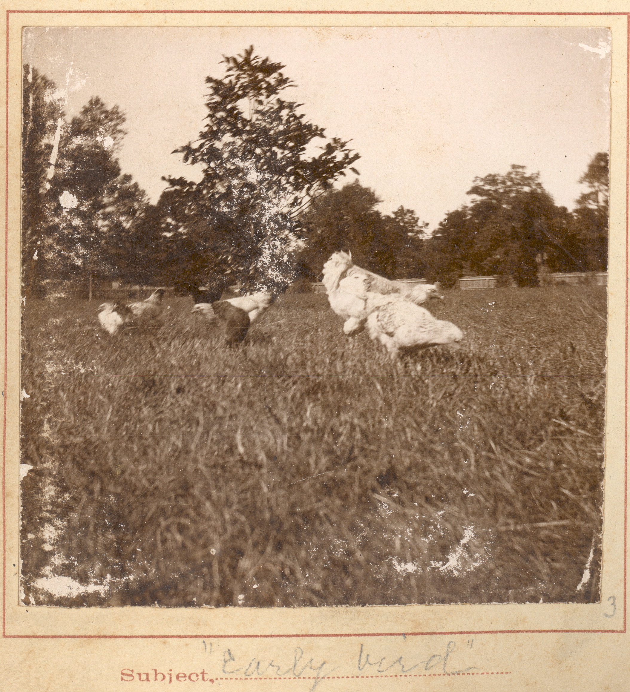 Hens and roosters in a fenced in yard. Title taken from caption beneath photo.