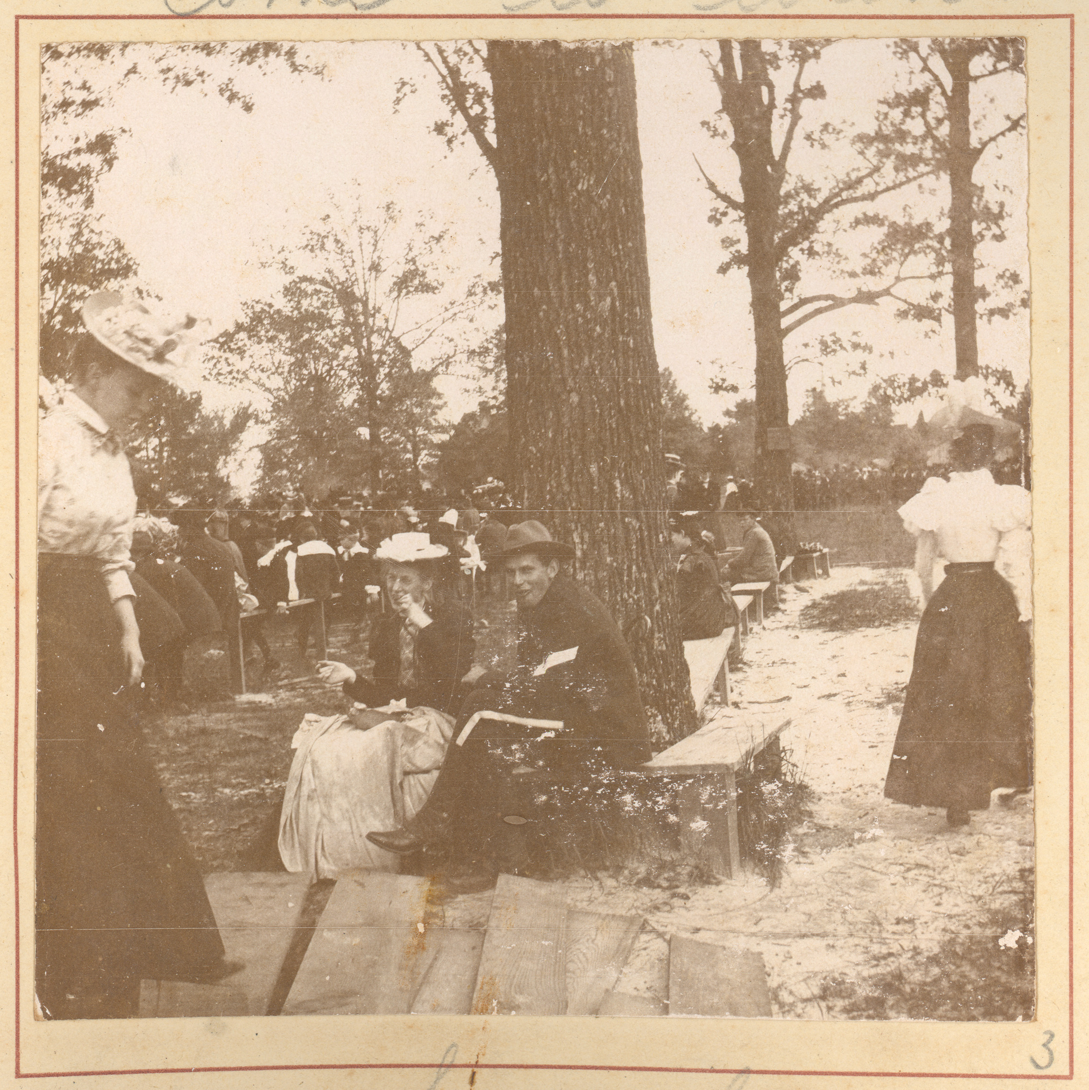 People sitting and standing in a group. One person is in a military uniform. The person seated next to the soldier appears to be eating. Smoke is visible in the background, probably where the food is being cooked. This is believed to be the picnic that is also pictured in photo number 2_19_4 and 2_20_2. Title taken from caption beneath photo.