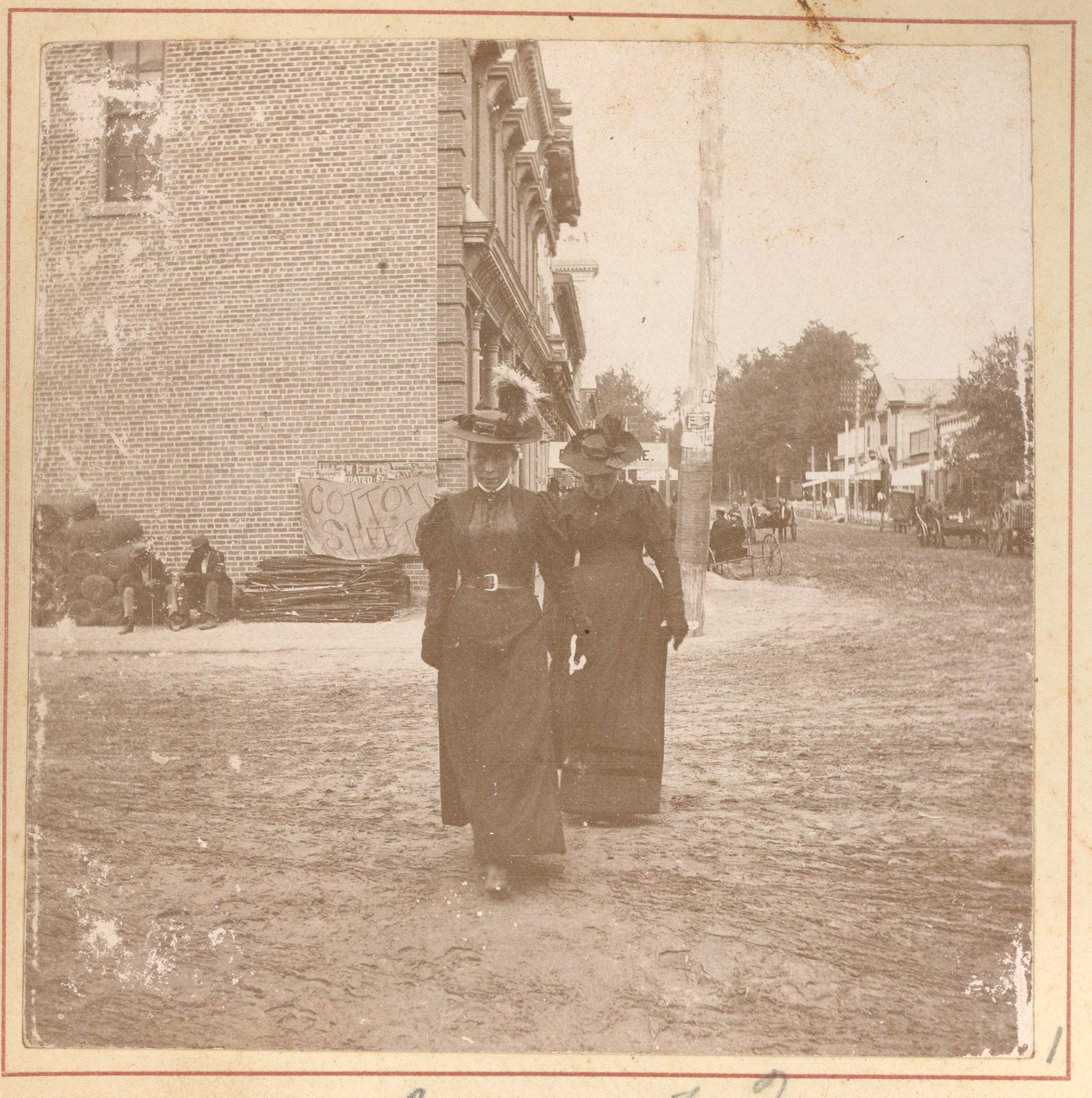 Two people crossing a corner on Main Street. People are visible in the background, leaning against the building with a sign that reads "Cotton Sheets." The clock tower is visible in the background on the right side of the photograph. Title taken from caption beneath photo.