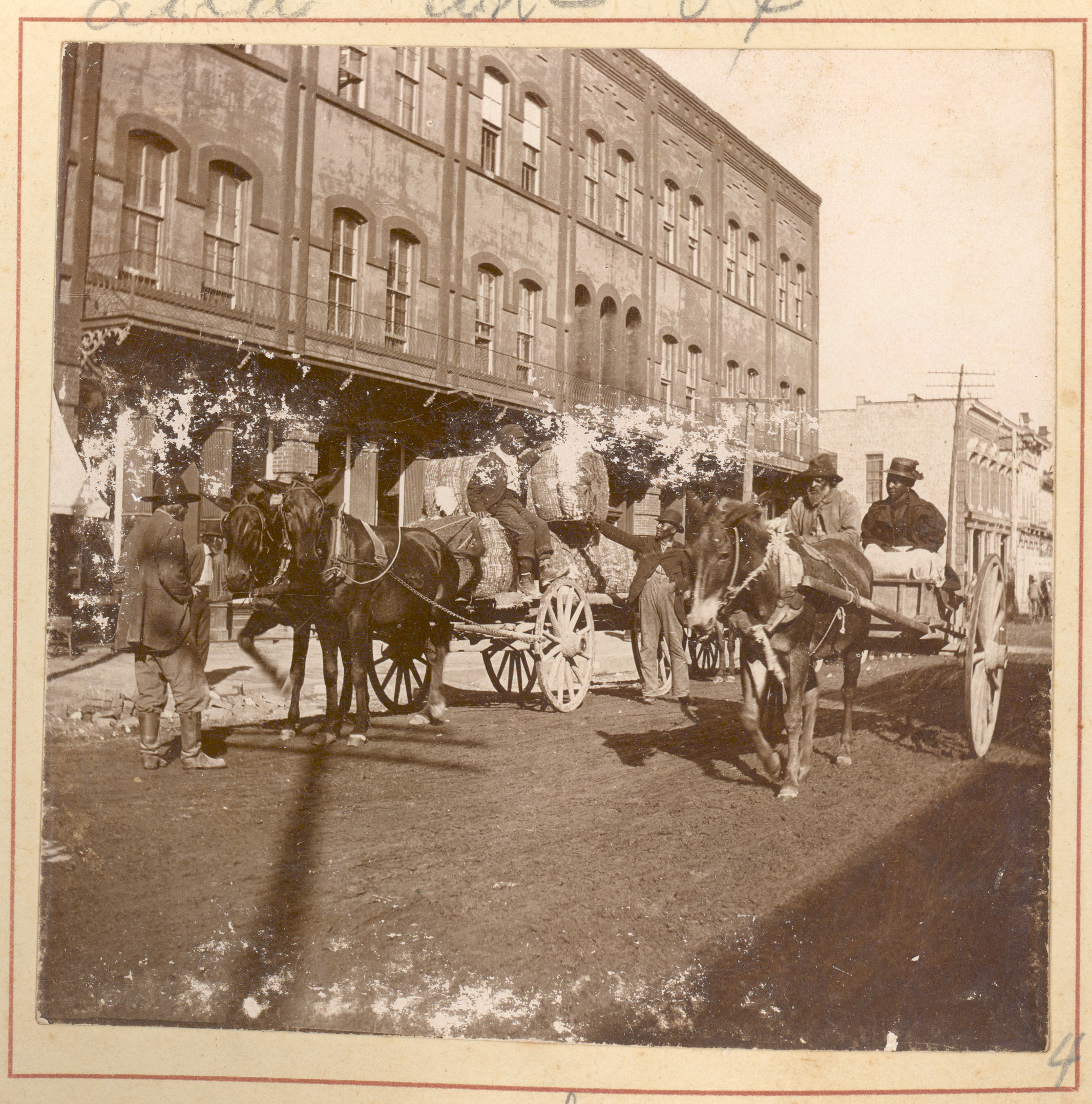 People in and around two carts, one with bales of cotton in it, in front of the Farrar Hotel on the corner of Main and St. James Streets in Tarboro, NC. Another building is visible in the background. Title taken from caption beneath photo.