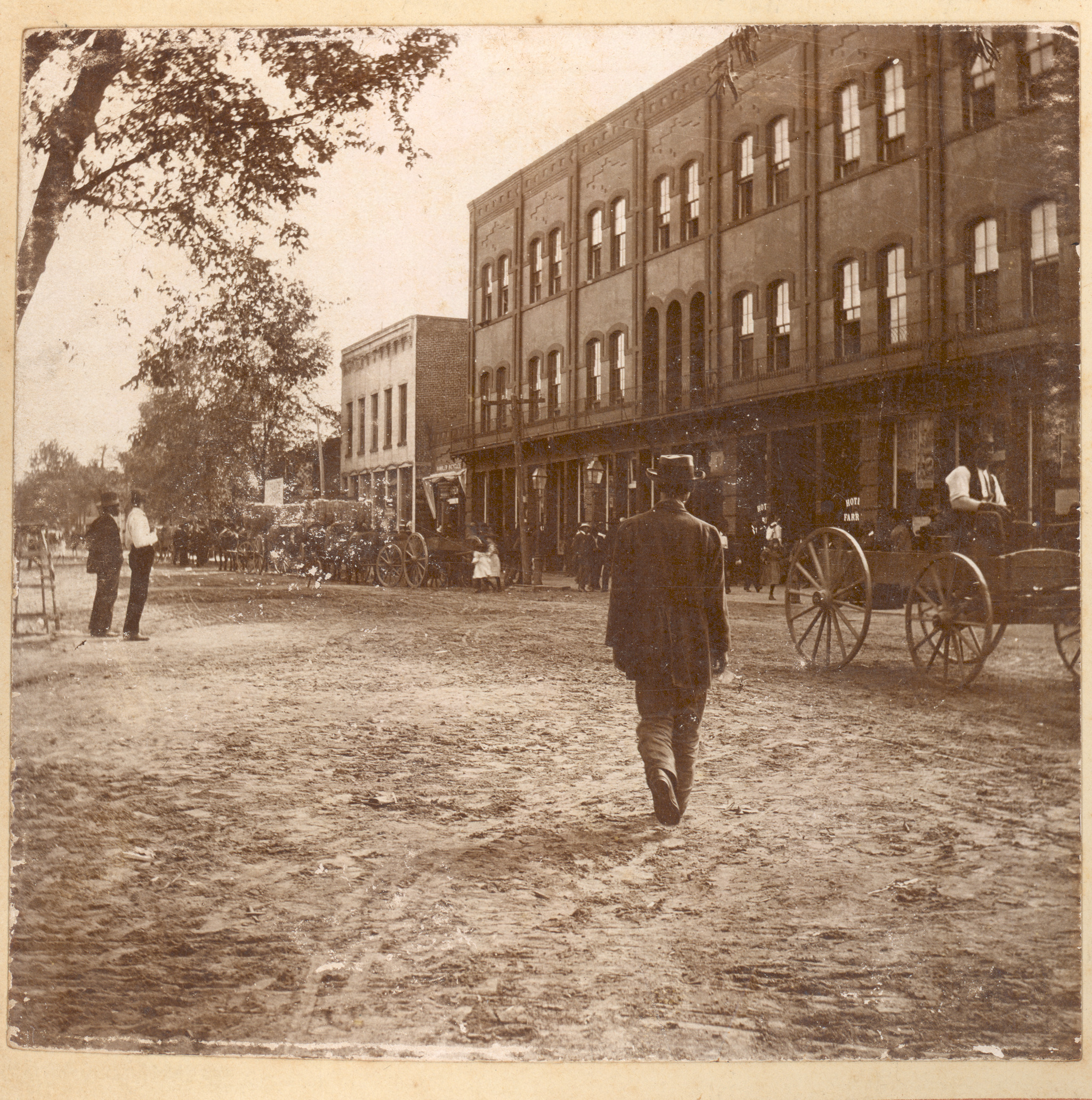 People in the street in front of the Hotel Farrar. Someone is driving a wagon past the hotel. Several pedestrians are visible walking on the sidewalk. In the distance carts are visible with bundles of what appears to be cotton parked on the side of the road. Title taken from caption beneath photo.