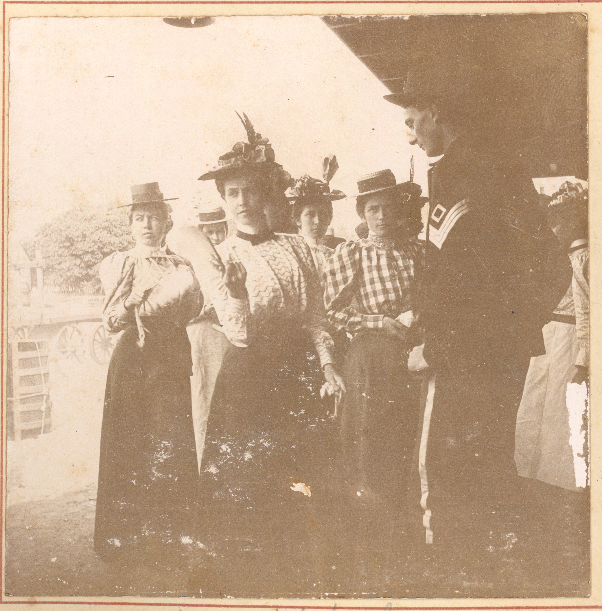 A group of adults pictured with a soldier, identified as Tom Gatlin, at the train depot. This is believed to be a photograph of people seeing soldiers off to the Spanish War. Title taken from caption beneath photo.