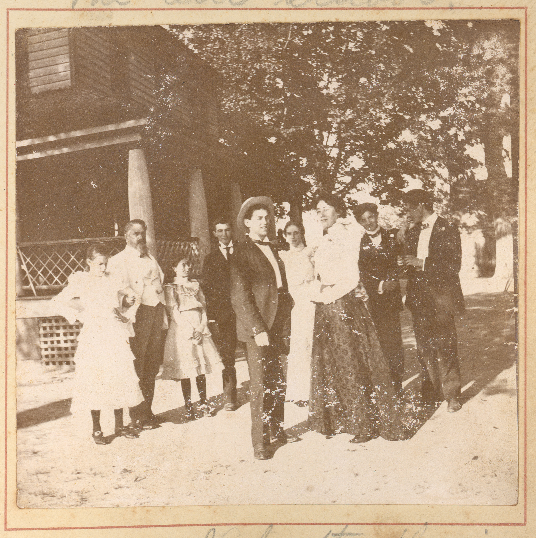 A group of people standing in the yard in front of a house. Title taken from caption beneath photo.