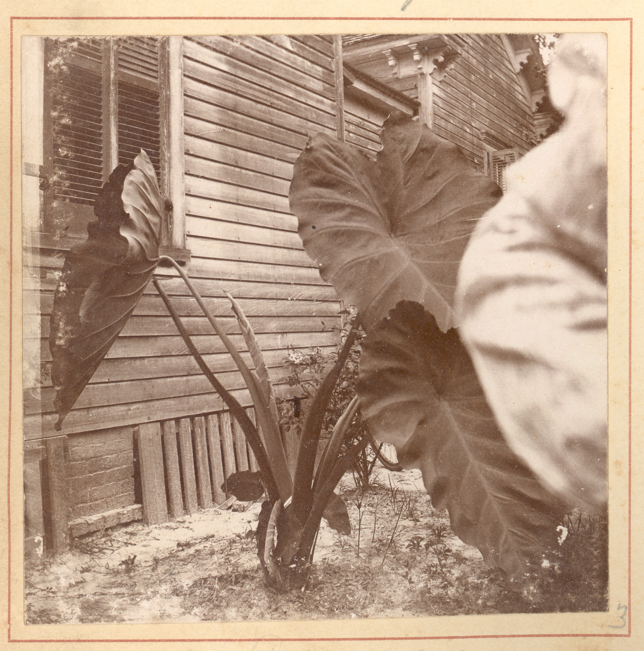 A large Elephant Ear plant in a yard. A house is visible in the background. A person's arm is visible on the right side of the photograph. Title taken from caption beneath photo.