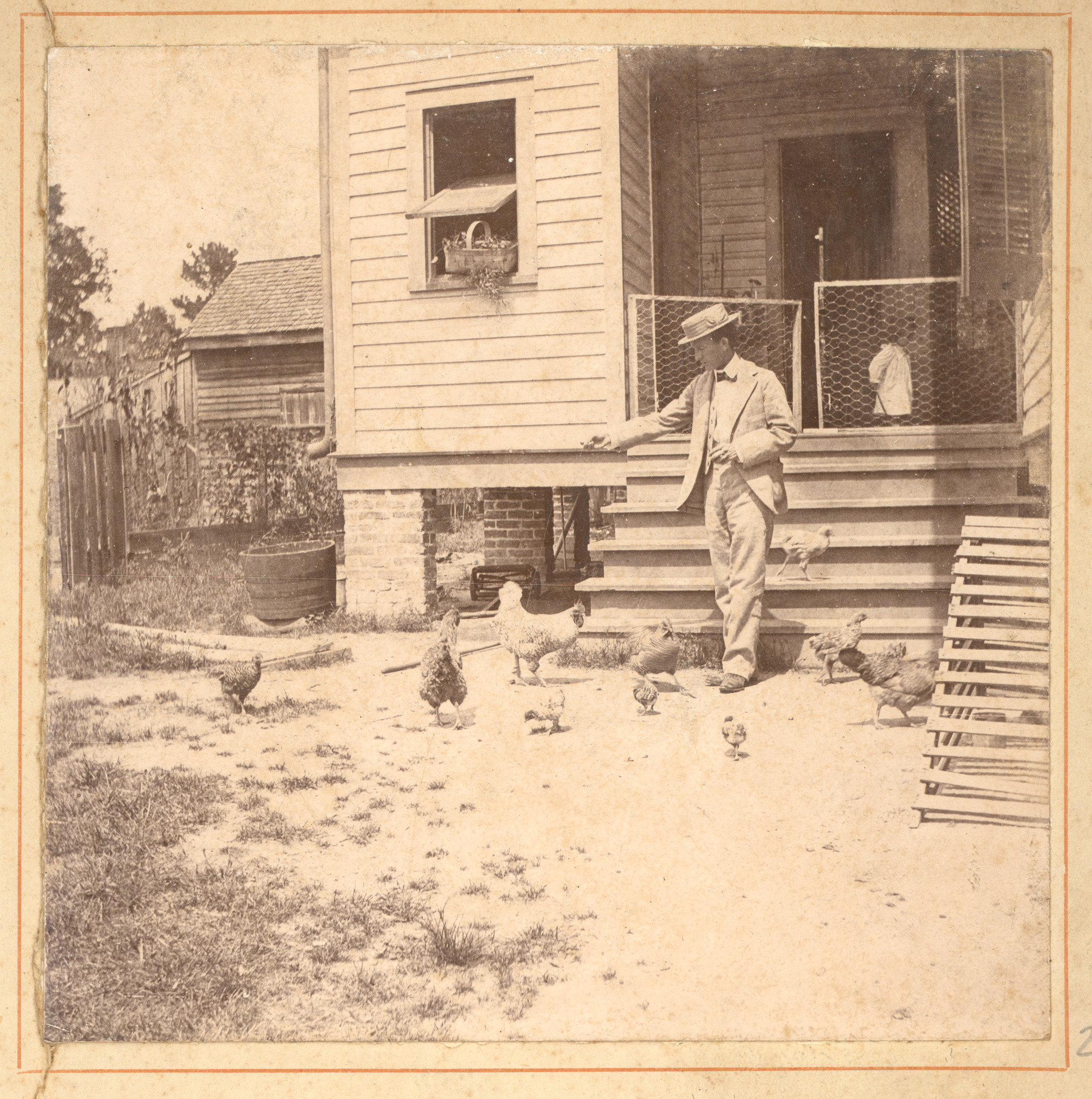 Unidentified Adult in a Suit Feeding Chickens in a Yard