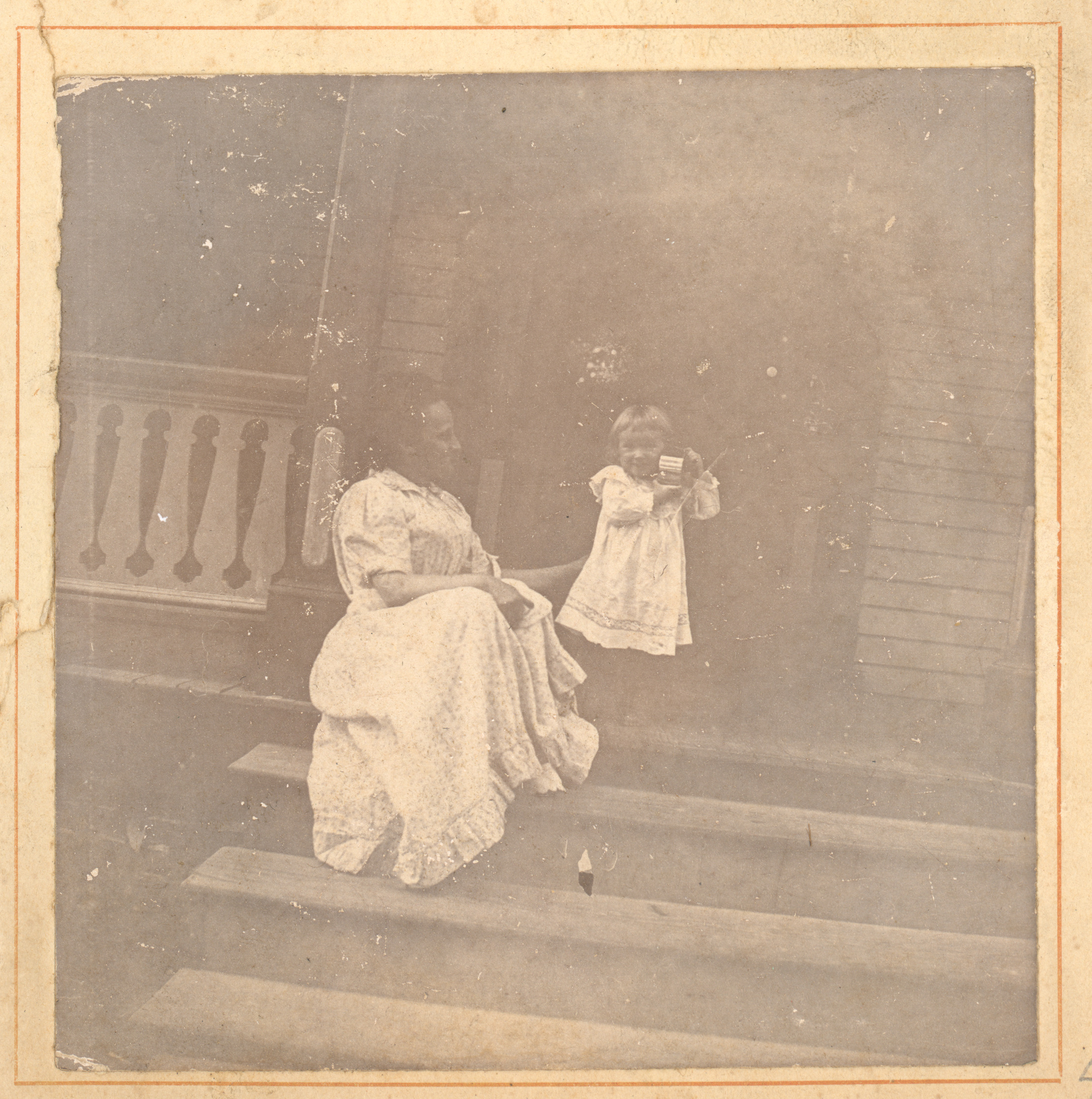 Child on a Porch Holding a Small Pan or Bowl with Seated Adult in a Dress