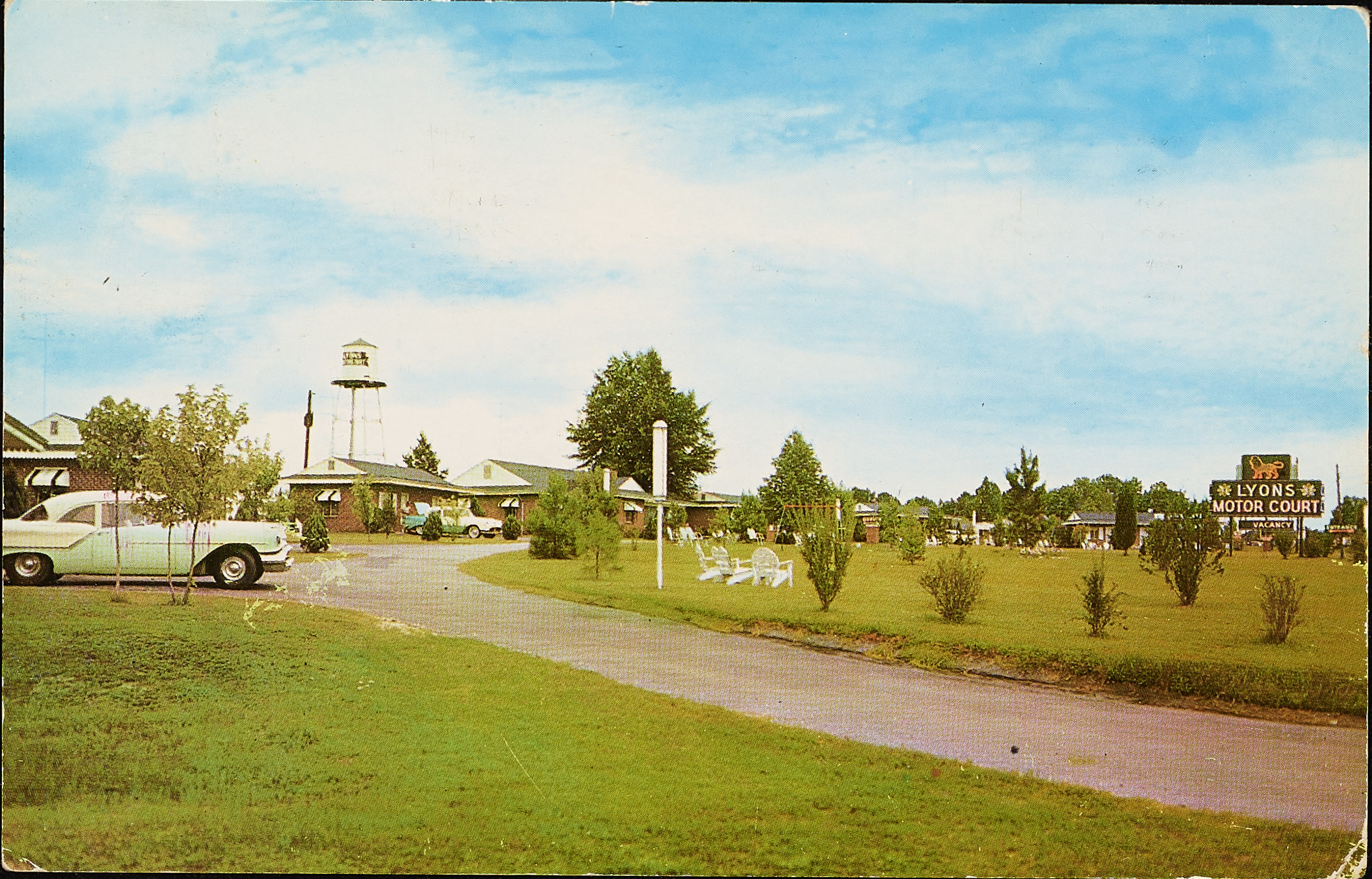 Transcribed from postcard text: "Lyons Motor Court Restaurant adjoining - U.S. Highways 1, 15 & 501 … 3 miles north of Sanford North Carolina, telephone Spring 4-3871 - 12 all brick units with private baths & showers. Mr. and Mrs. Berl O. Spitler Owners & Operators" Handwritten on reverse: "On our way home here tonight (5/2) after a very nice visit in Fla. Expect to be with Roger + Lee Thurs. and home by Sat. See you later. Dodges" [Addressed to N.H.]
