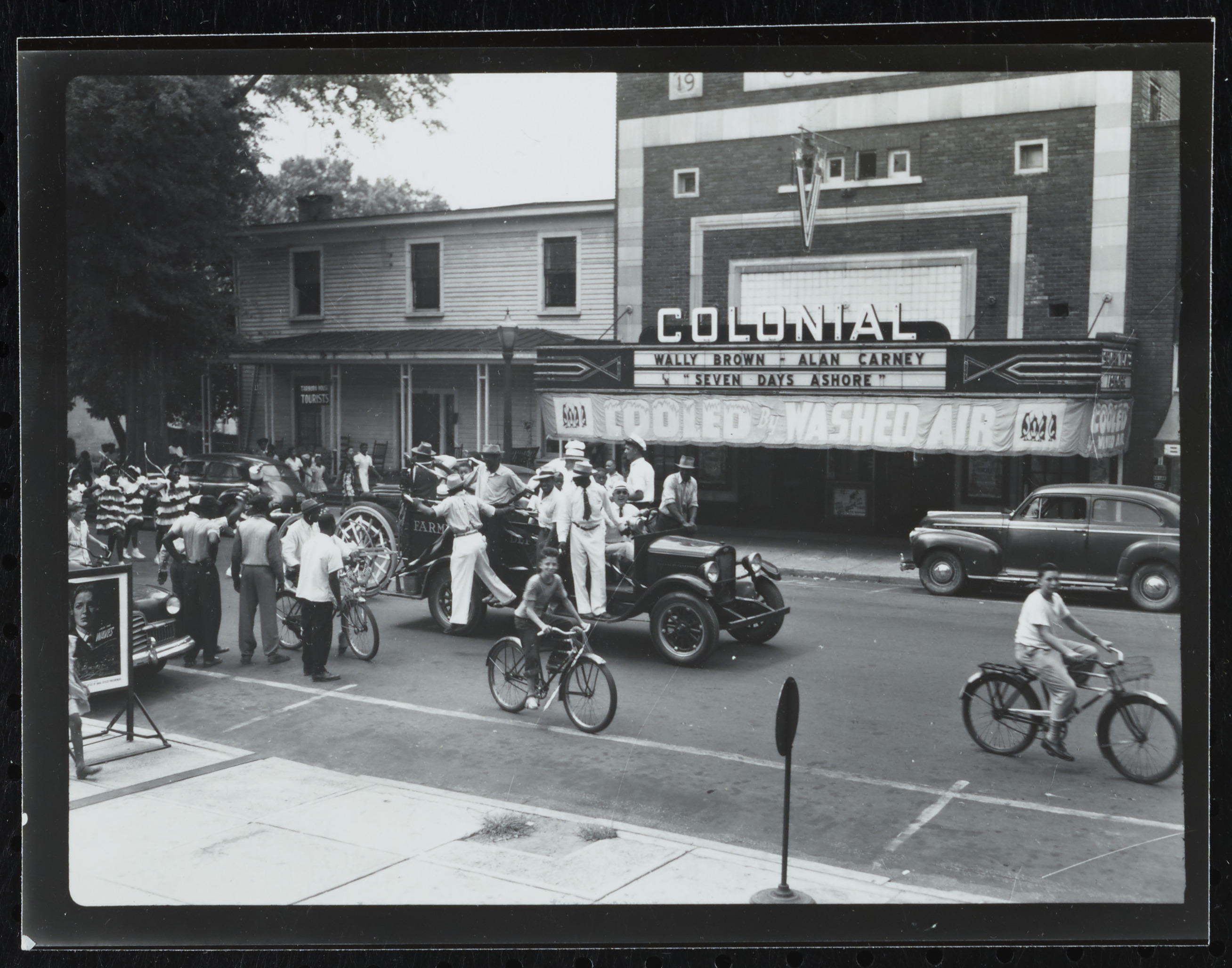 Parade on Main St. 500 block, Tarboro, N.C. Colonial Theater marquee reads "Wally Brown - Alan Carney "Seven Days Ashore." Most of the participants and spectators appear to be Black.