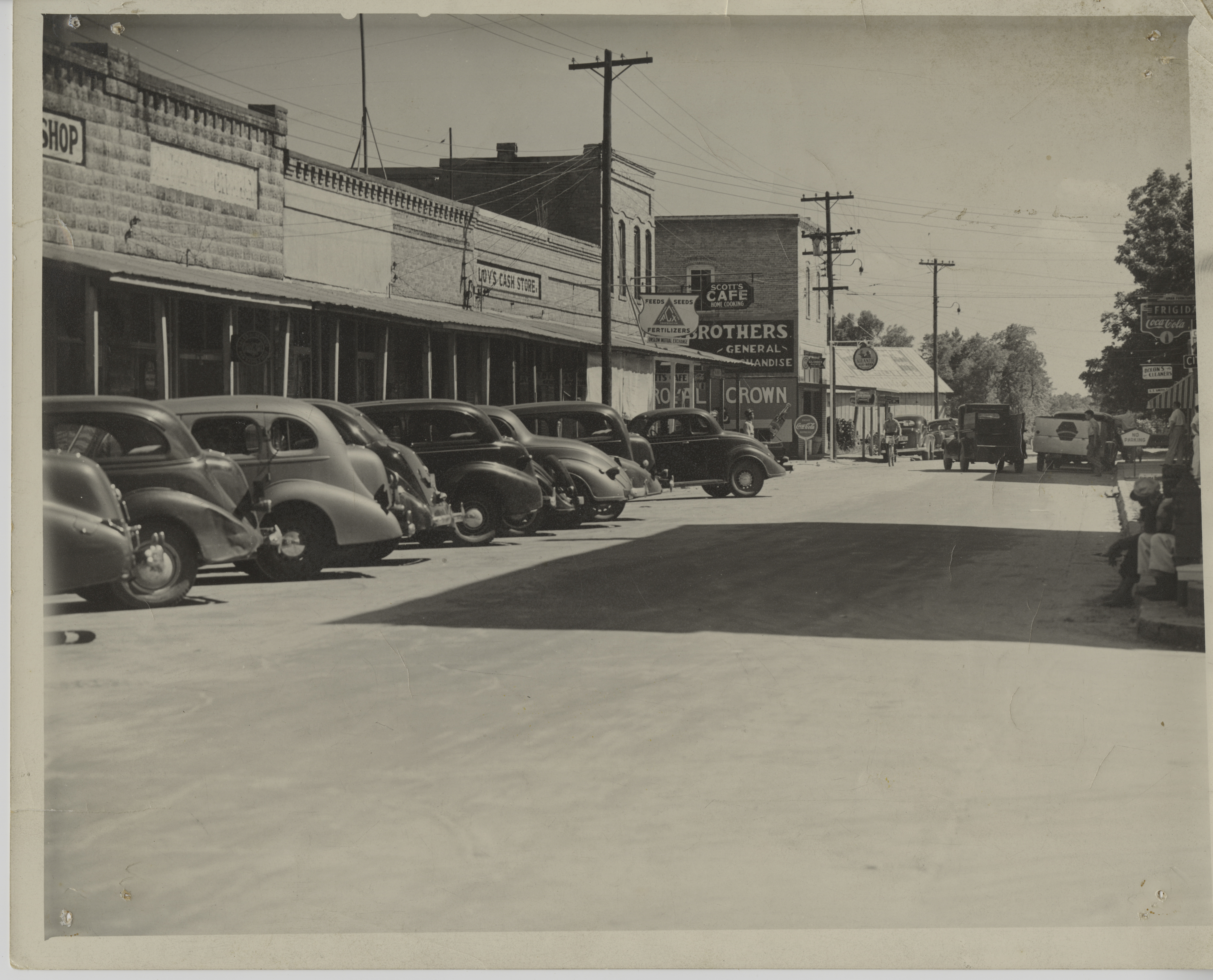 Signs include Dixon's Cleaners; Loy's Cash Store; Scott's Café