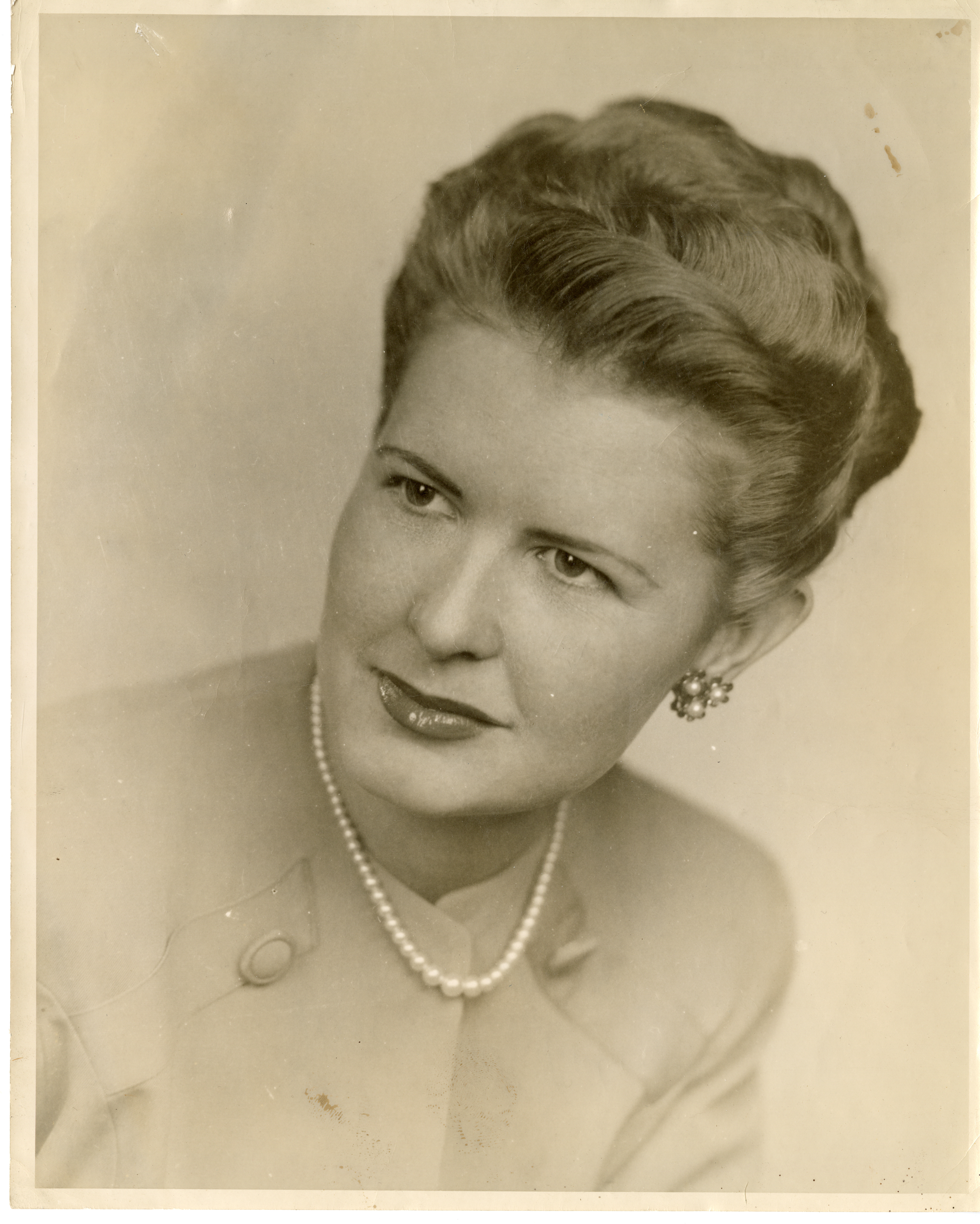 Portrait of an adult in a blouse wearing a pearl necklace and earrings with three pearls in them.