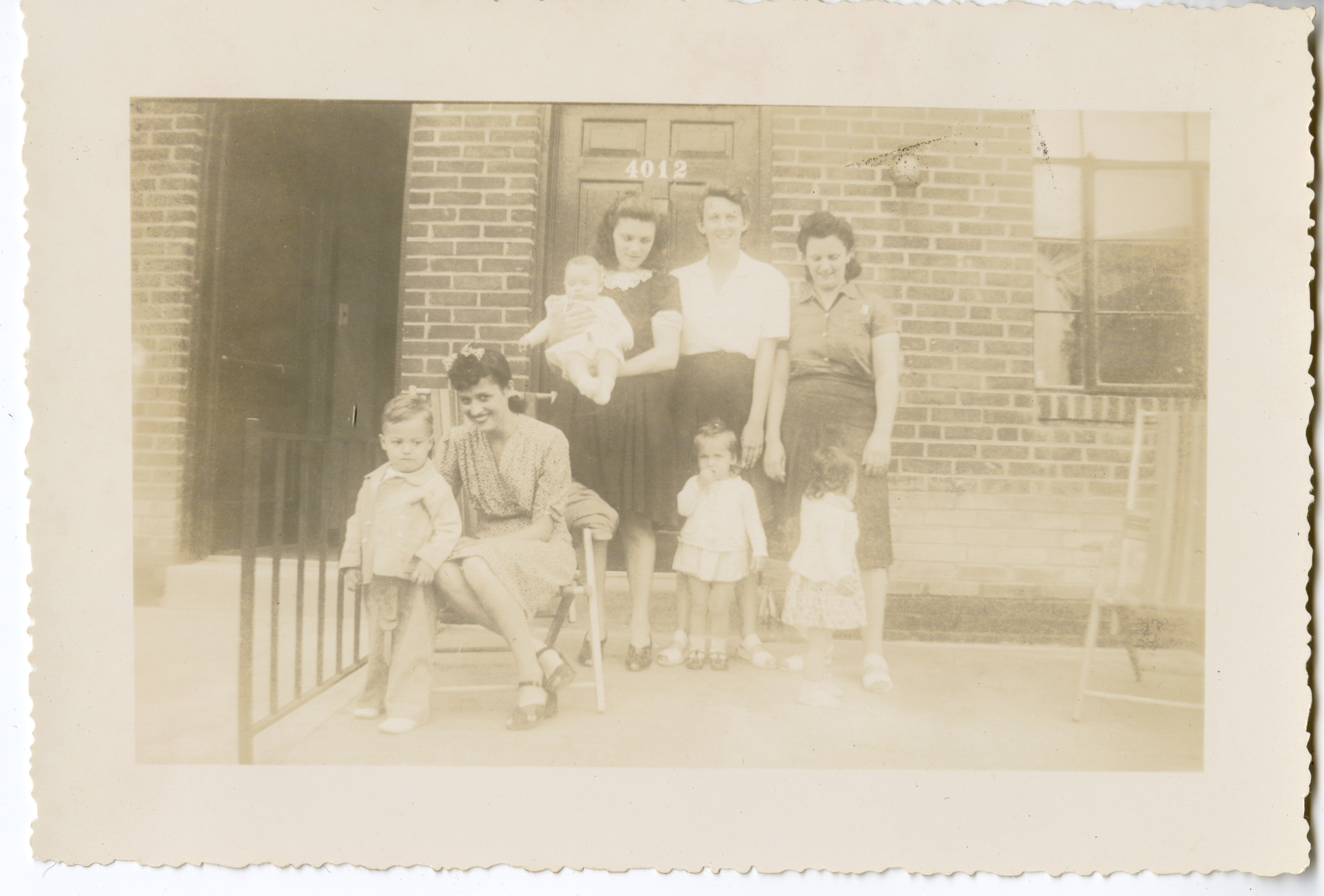 A black and white portrait of 4 women with four children. They are on the porch of unit 4012. Three women are standing and one woman is seated.