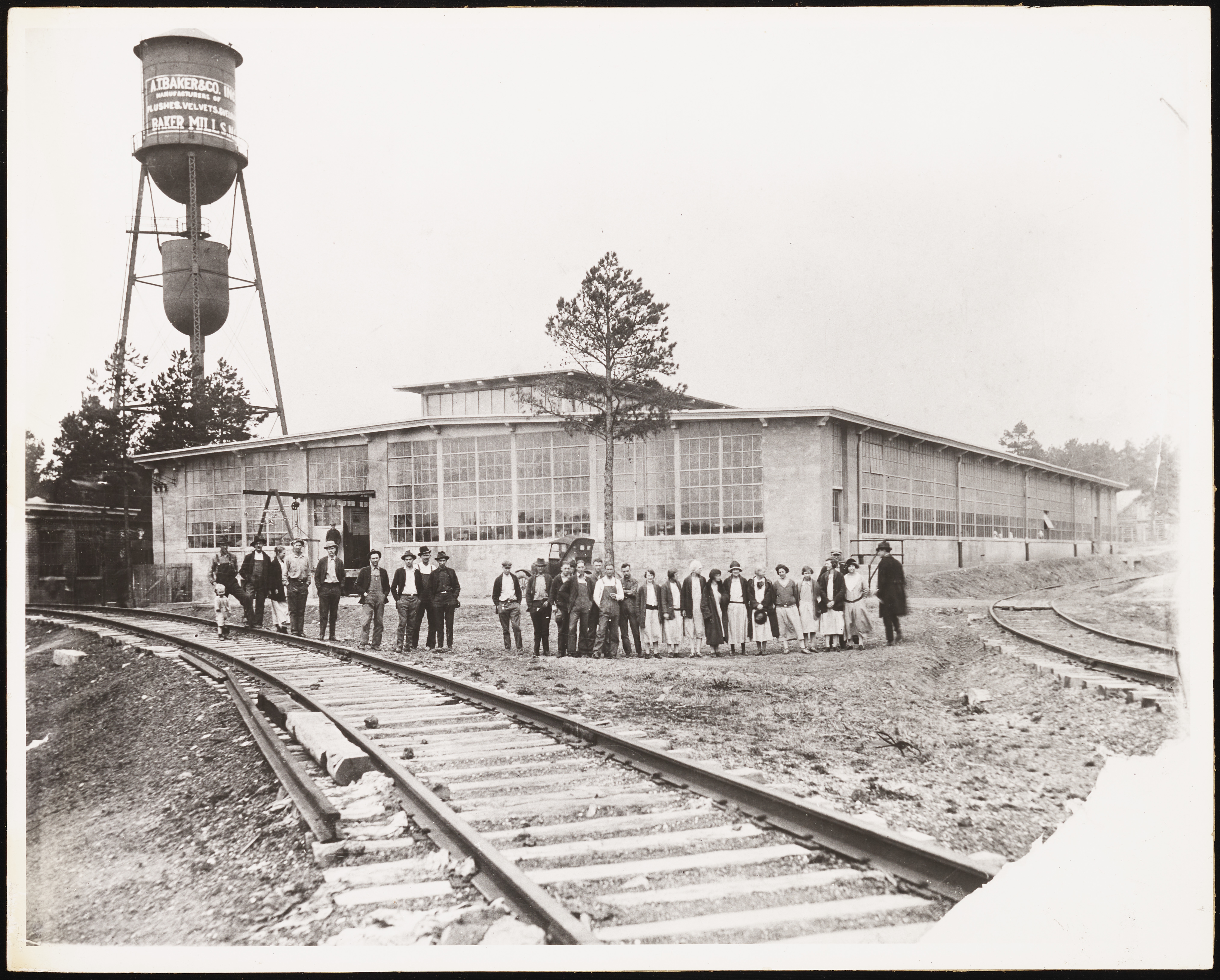 A 1925 photograph of the A.T. Baker Mill. The mill would eventually become Collins & Aikman. Pictured from left to right, are: Clayton, Semmie; Mr. Philpott; Mrs. Philpott; Dixon, Jessie; Regan, Feliz; Bledscoe, Tom; Blanks, Jack; Clayton, Drongham; Clayton, Charlie; Philpott, Harley; Newcomb, Lex; Clayton, John; Clayton, Willie; Tingen, Rid; Unknown; Royster, Sam; Dickerson, Matt; Mooney, Annie; Clayton, Mattie; Clayton, Clara; Mooney, Bunchie; Walker, Lottie; Clayton, Geneva; Tingen, Mrs. Red; Clayton, Lena; Dickerson, Evelyn; Mooney, Joe; Walker, Nancy; Oakley, Dan