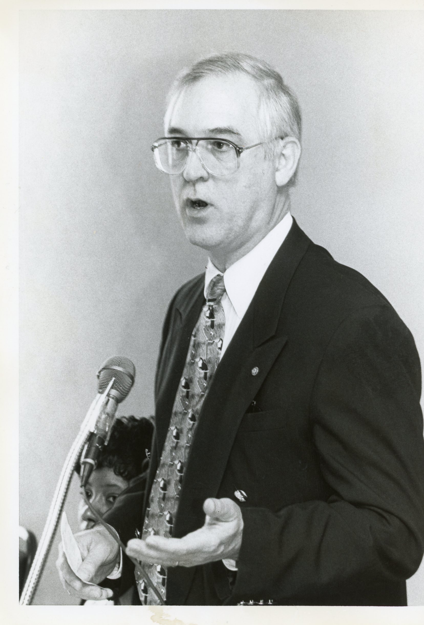 Dr. Douglas O. Eason, President, speaks at lecturn, unknown woman in the background, Statesville Campus, 1993.