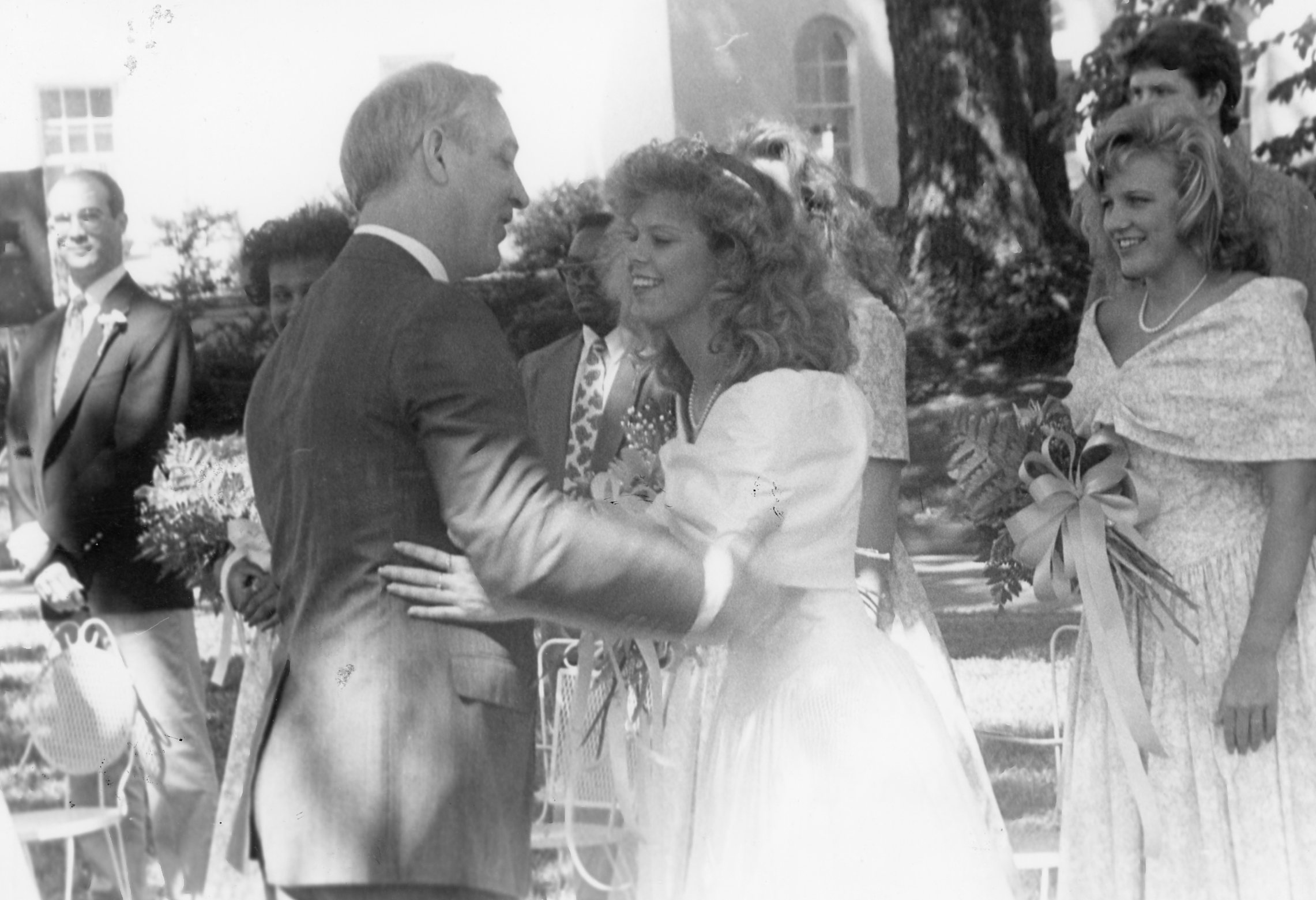 Foreground, left to right: Dr. Douglas O. Eason, President; Leigh Anne Sparks; Ranita Rash. May Court, date unknown.