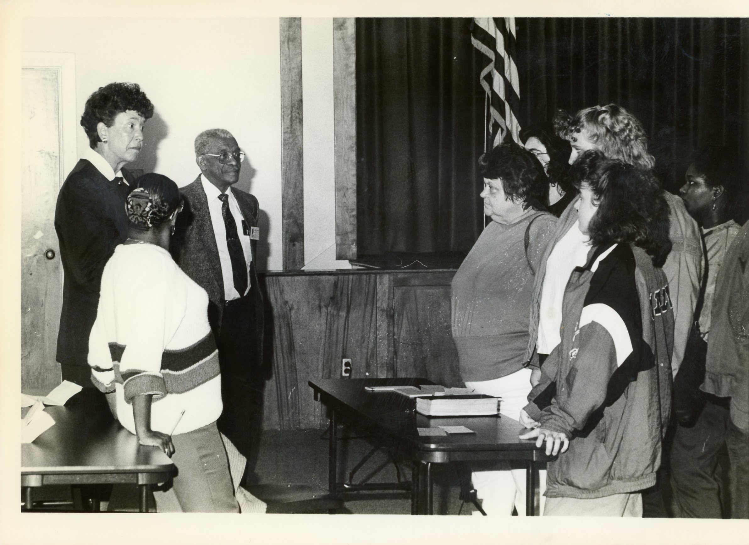 Mr. William Bradshaw standing with two unknown females, talking with housekeeping staff across a table, date unknown