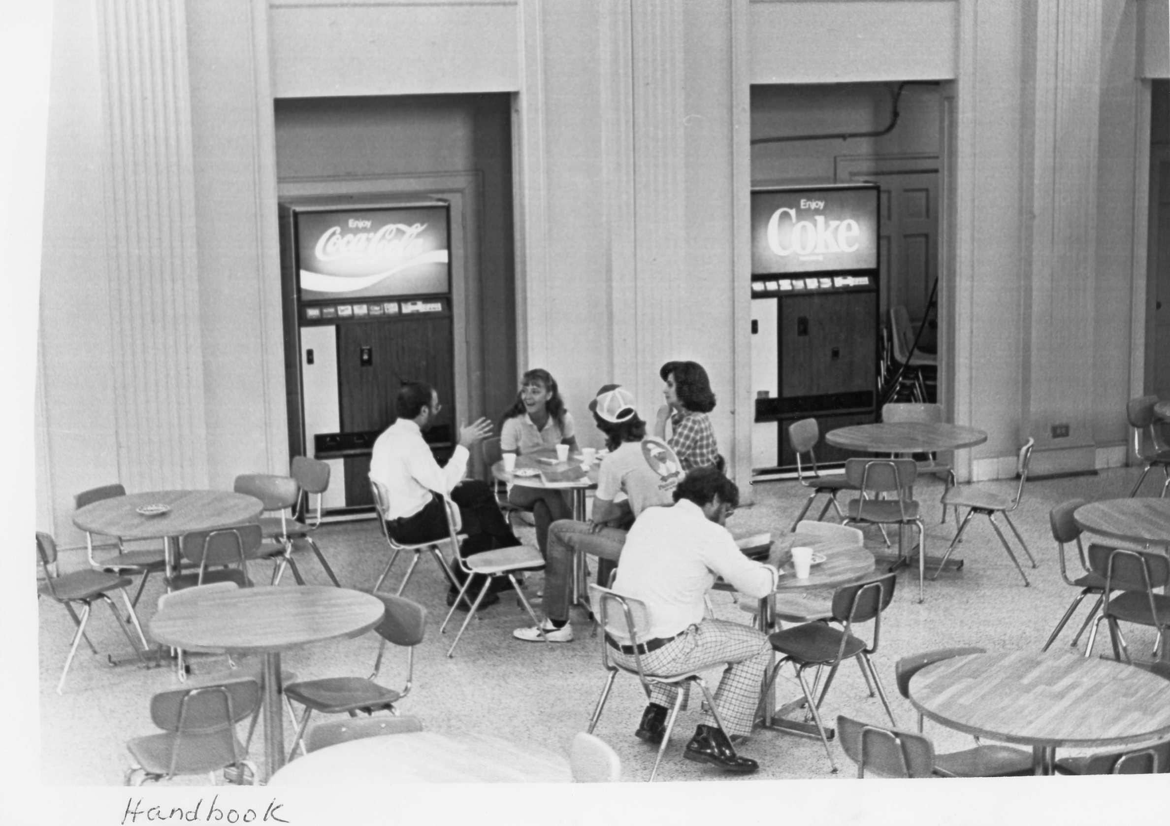 Four unknown students, two male and two female, in the cafeteria seated at a round table talking, another male student at an adjacent table reading, date unknown