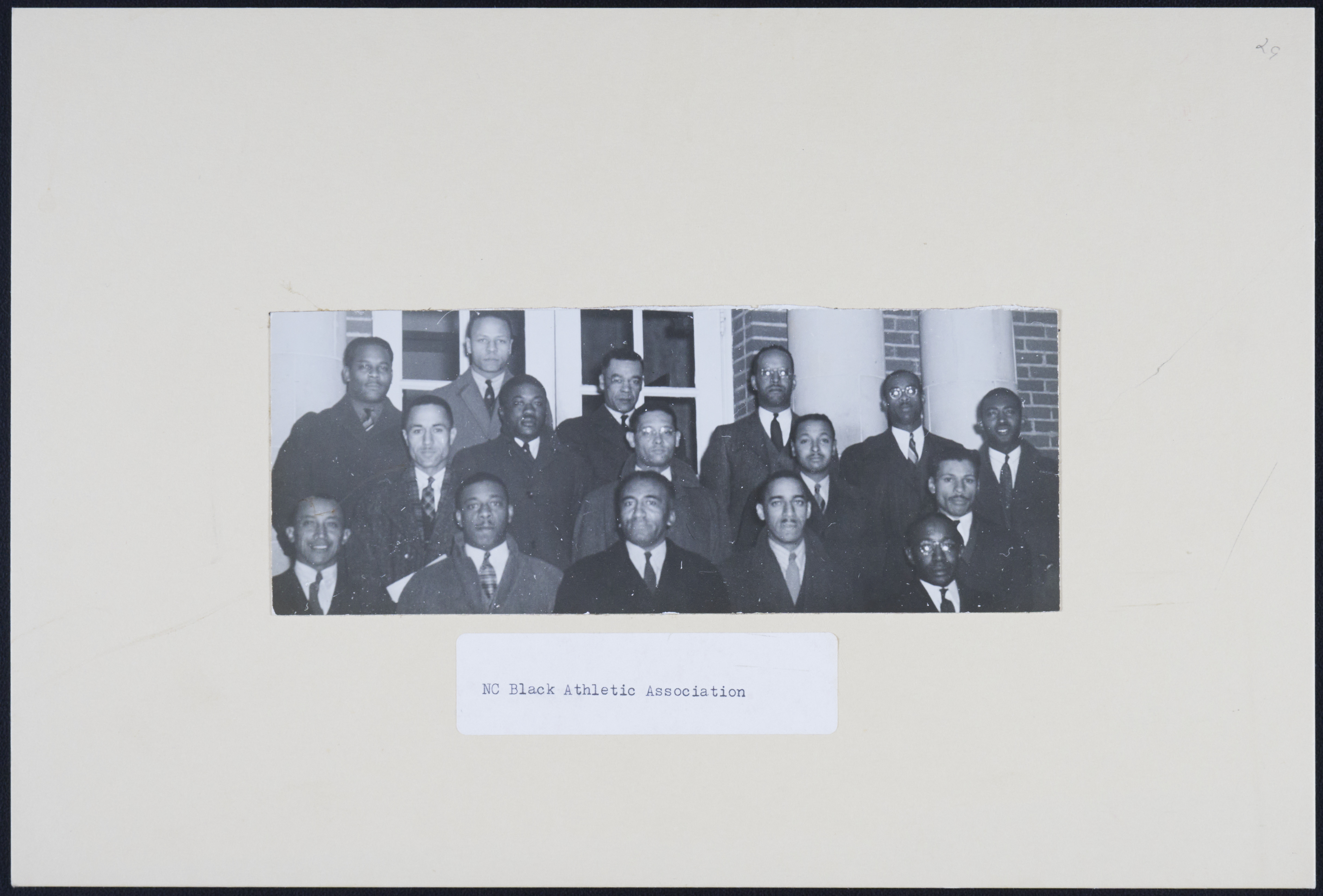 A black-and-white group portrait of 16 unidentified black men wearing suits.