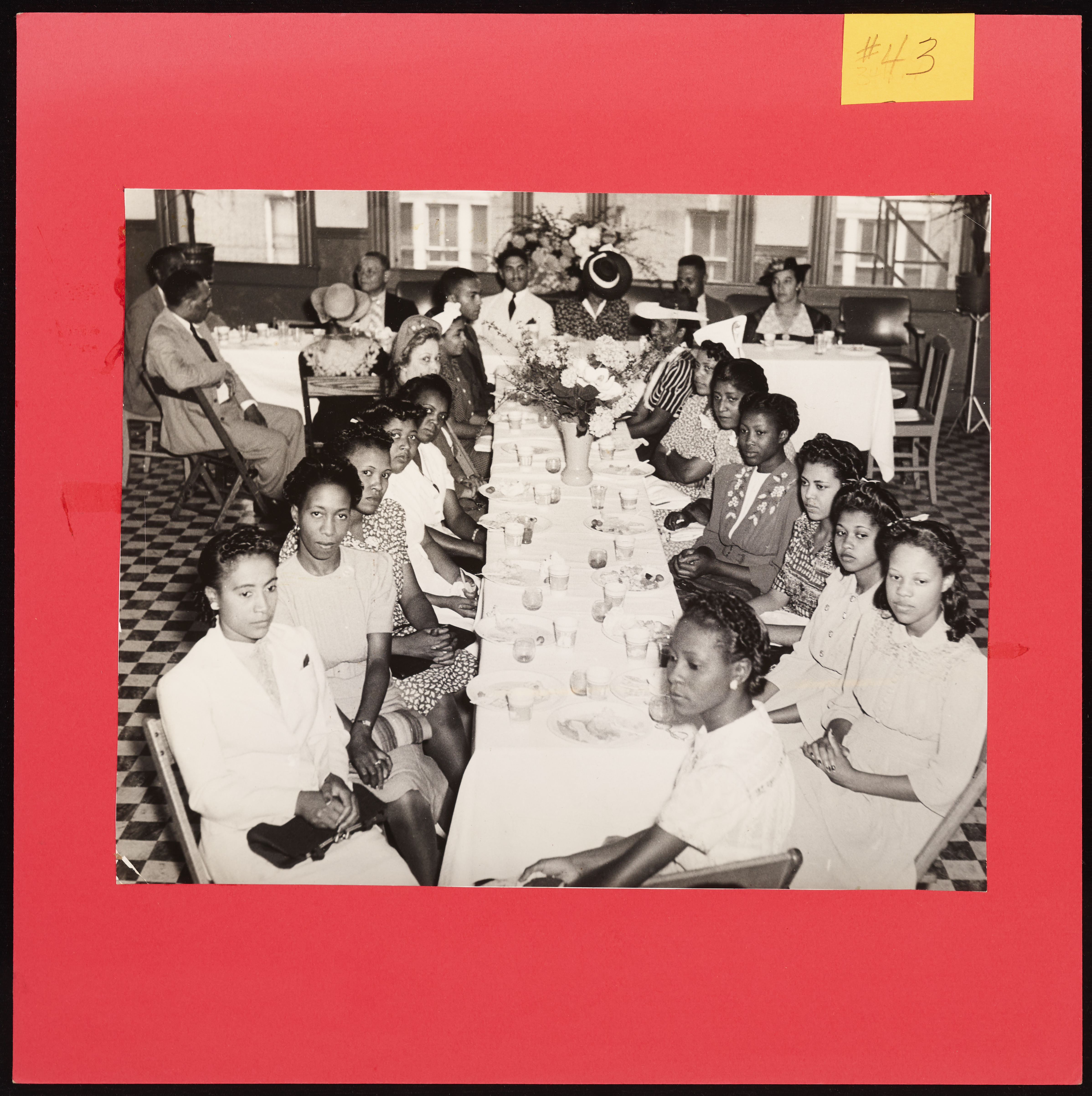 This photo depicts a breakfast hosted by a church located in or around Forsyth County, North Carolina. A table of people, most in dresses, look up at the camera. In the background, other tables of churchgoers can be seen.
