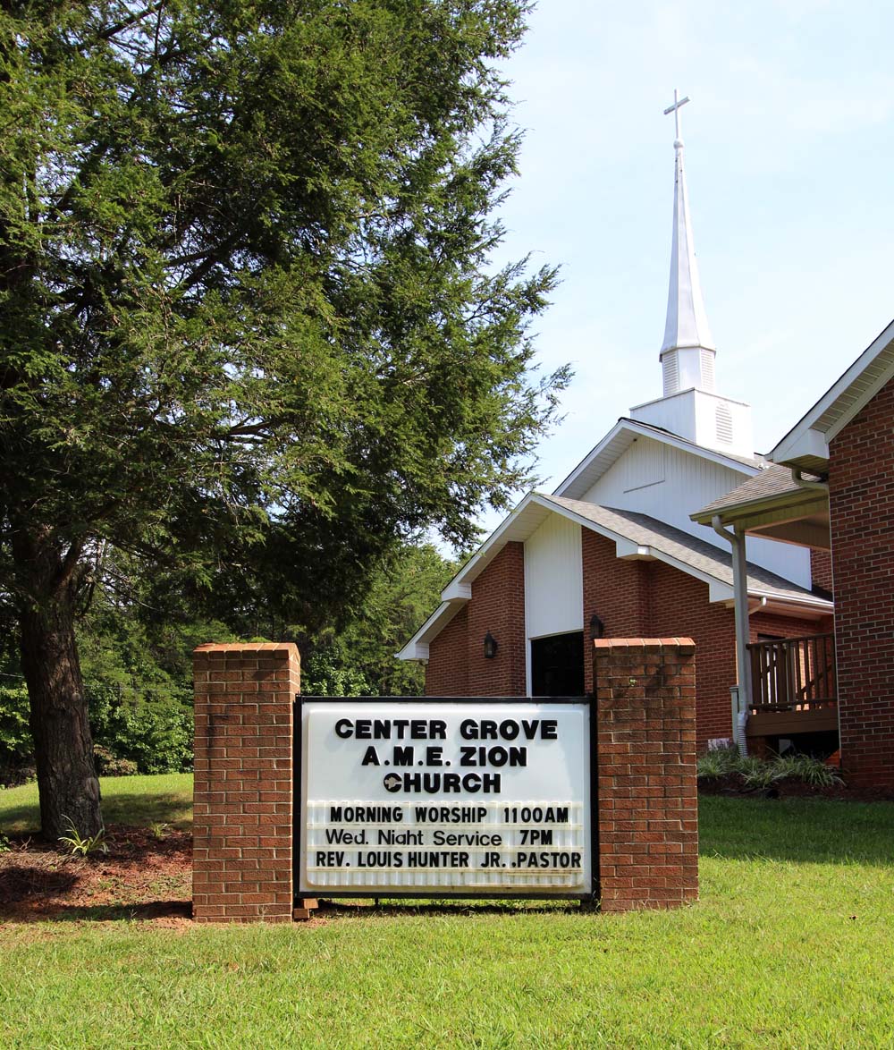 Sign reads Center Grove A.M.E. Zion Church, Morning Worship, 1100AM, Wed. Night Service 7PM, Rev. Louis Hunter Jr., Pastor