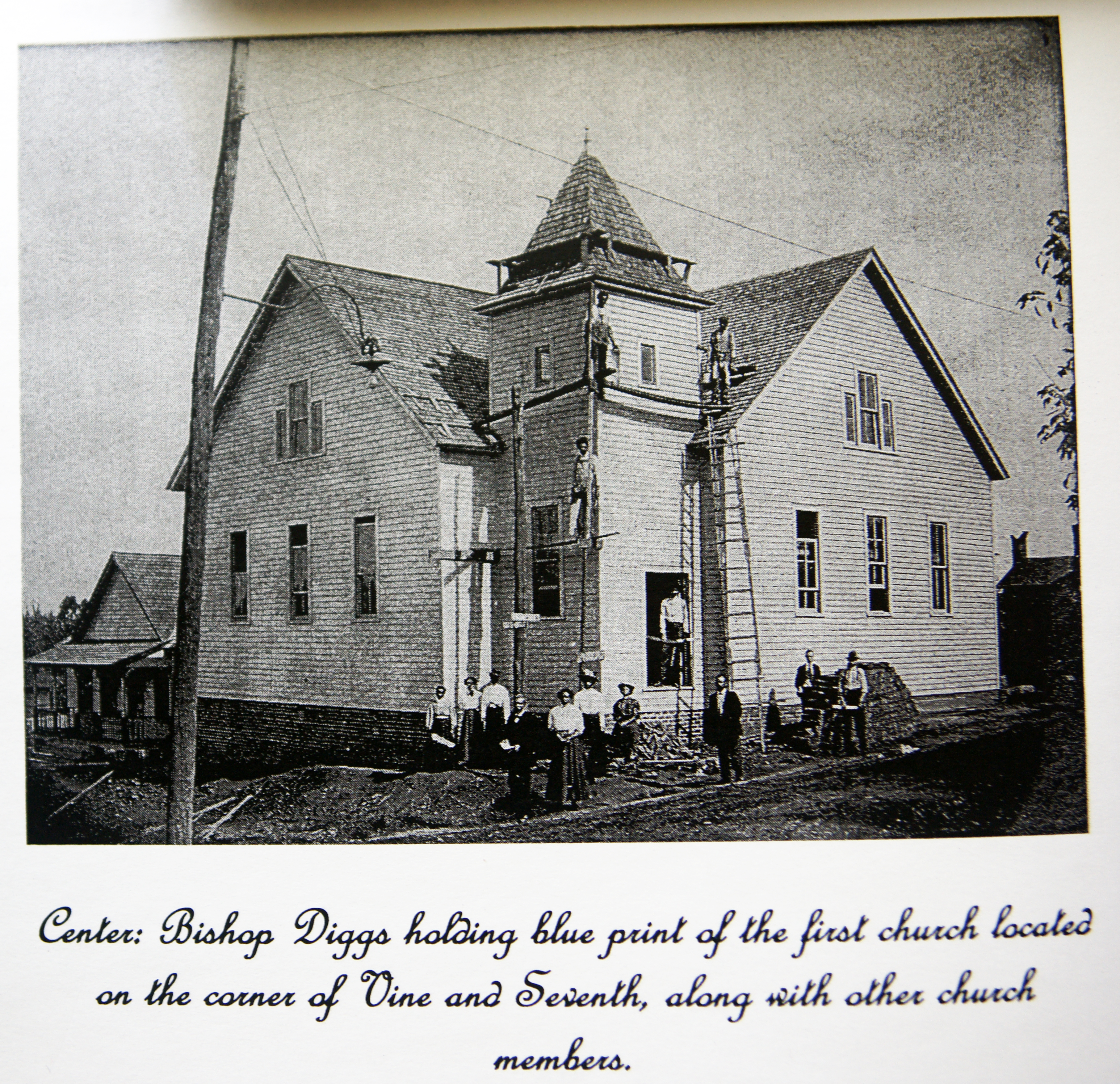 Transcription: Center: Bishop Diggs holding blue print of the first church located on the corner of Vine and Seventh, along with other church members.