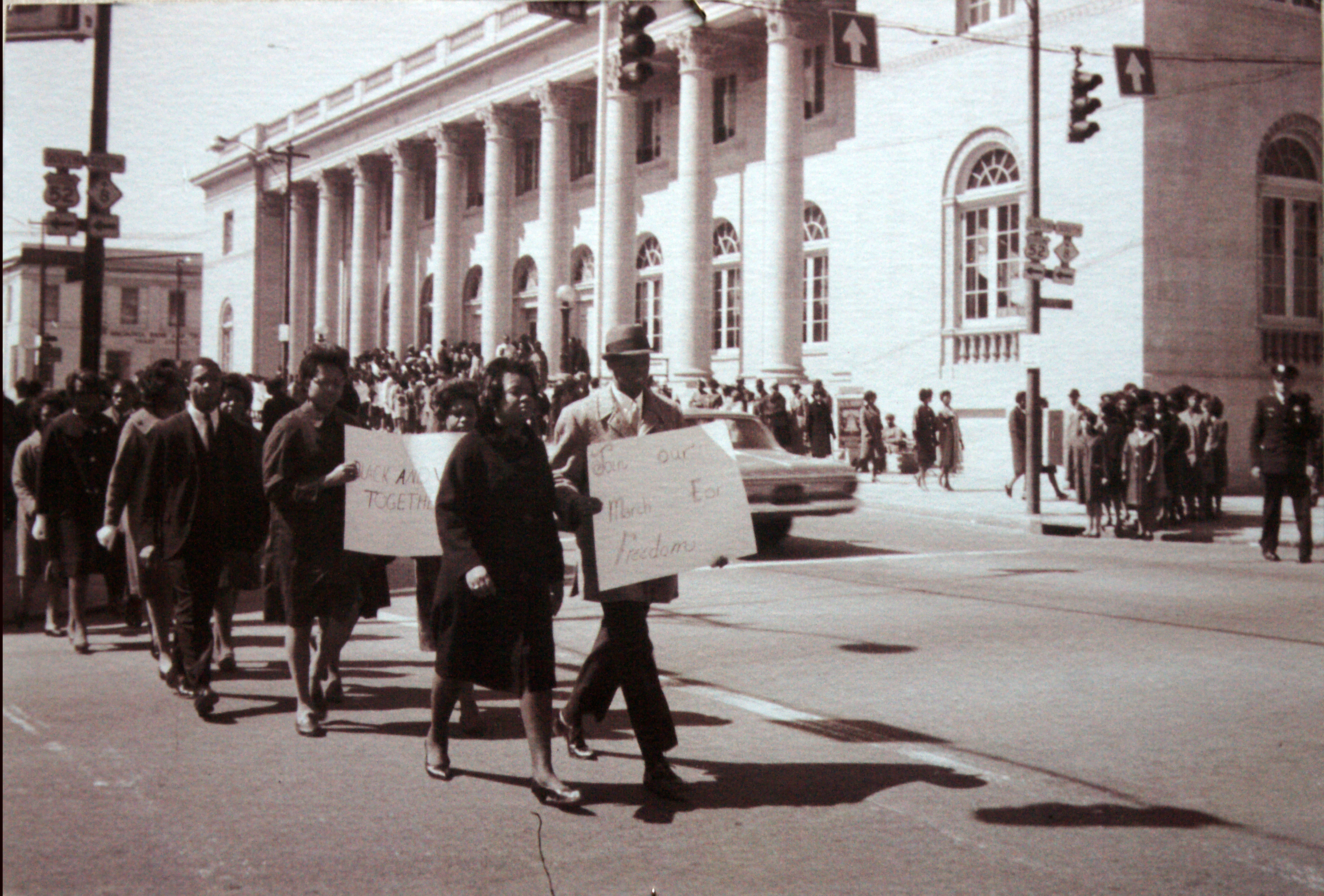Posters say "Join our march for freedom" and "Black and w[hite] together."