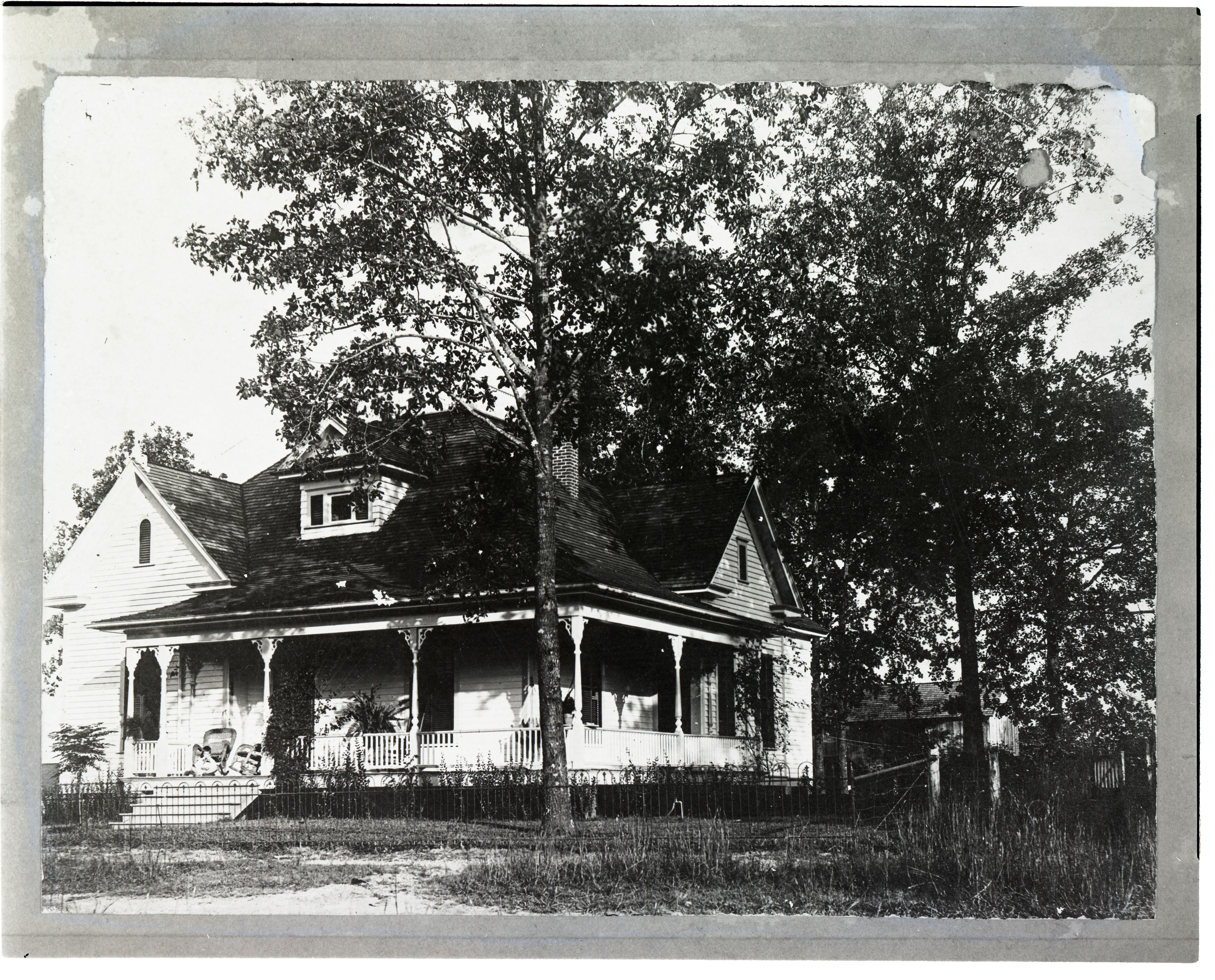 A black-and-white negative of a wooden house located on Summit Road in Sanford, North Carolina. The house belonged to Roscoe Carrington.