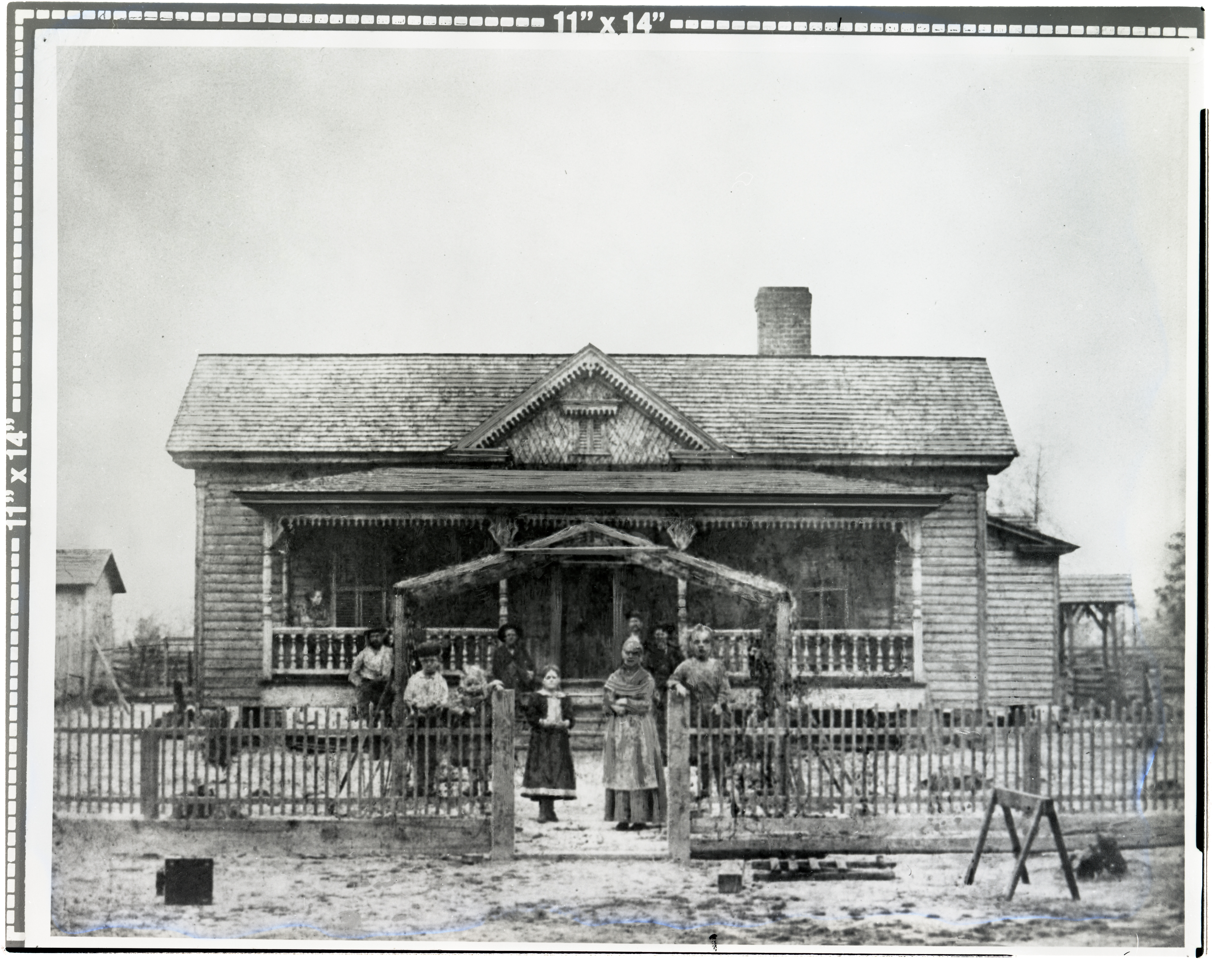 A black-and-white photograph of William Brooks and his friends and family at Pineknot Farm in Lee County, North Carolina.