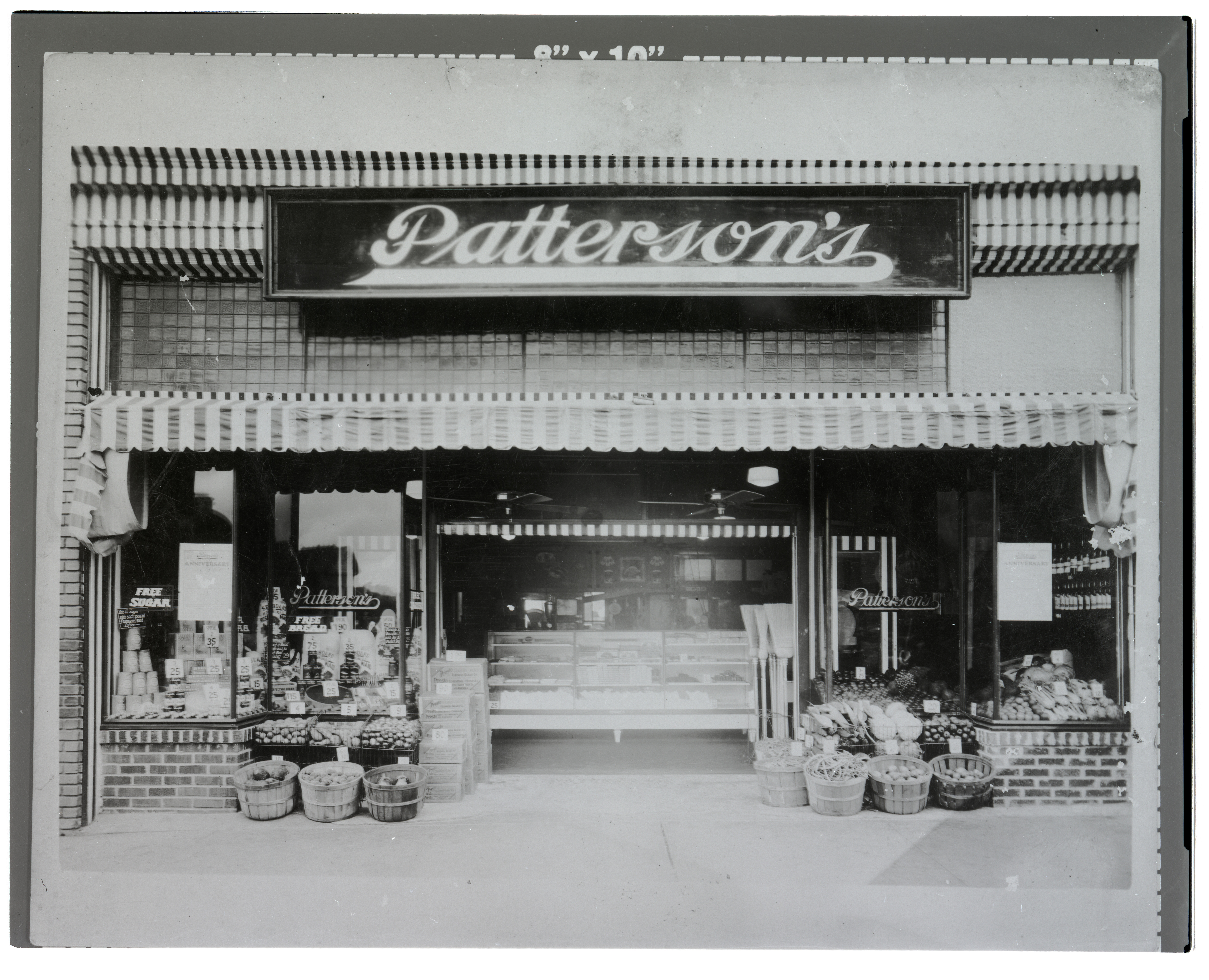 A black-and-white negative of Patterson's Store, taken around 1927 to 1929.