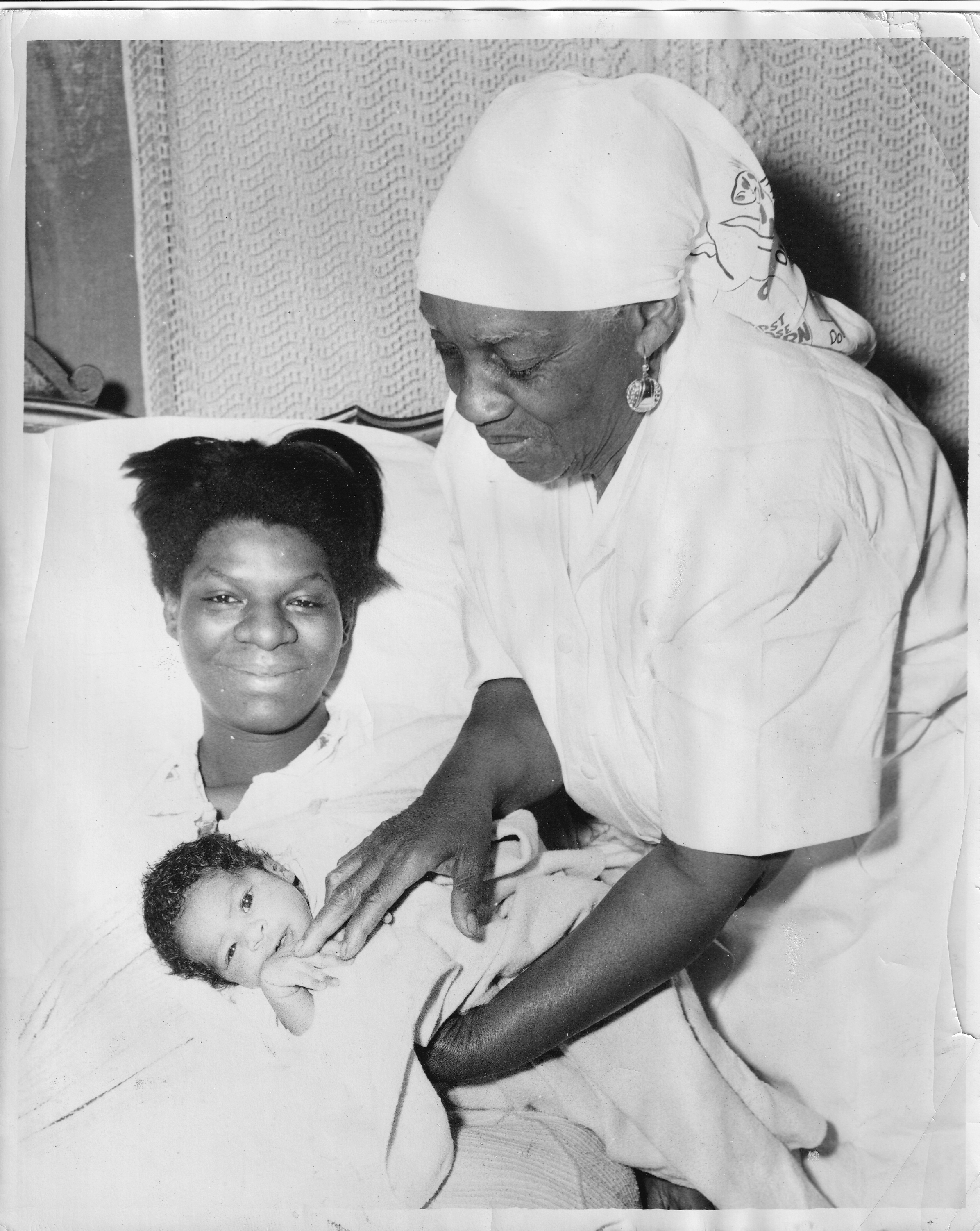 Mitchell O’Bryant McKeever, the first baby born in Lee County in 1955, shown with his mother and the midwife, Sarah James. Sarah James had been a midwife for more than 40 years at the time the article was written.
